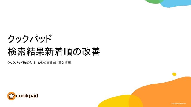 © 2023 Cookpad Inc. クックパッド 検索結果新着順の改善 クックパッド株式会社 レシピ事業部 重久直輝