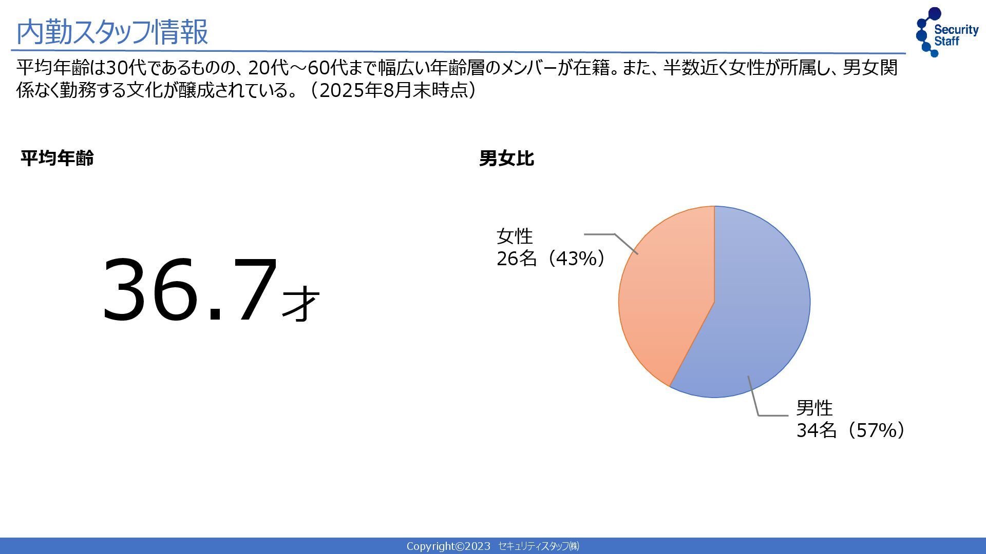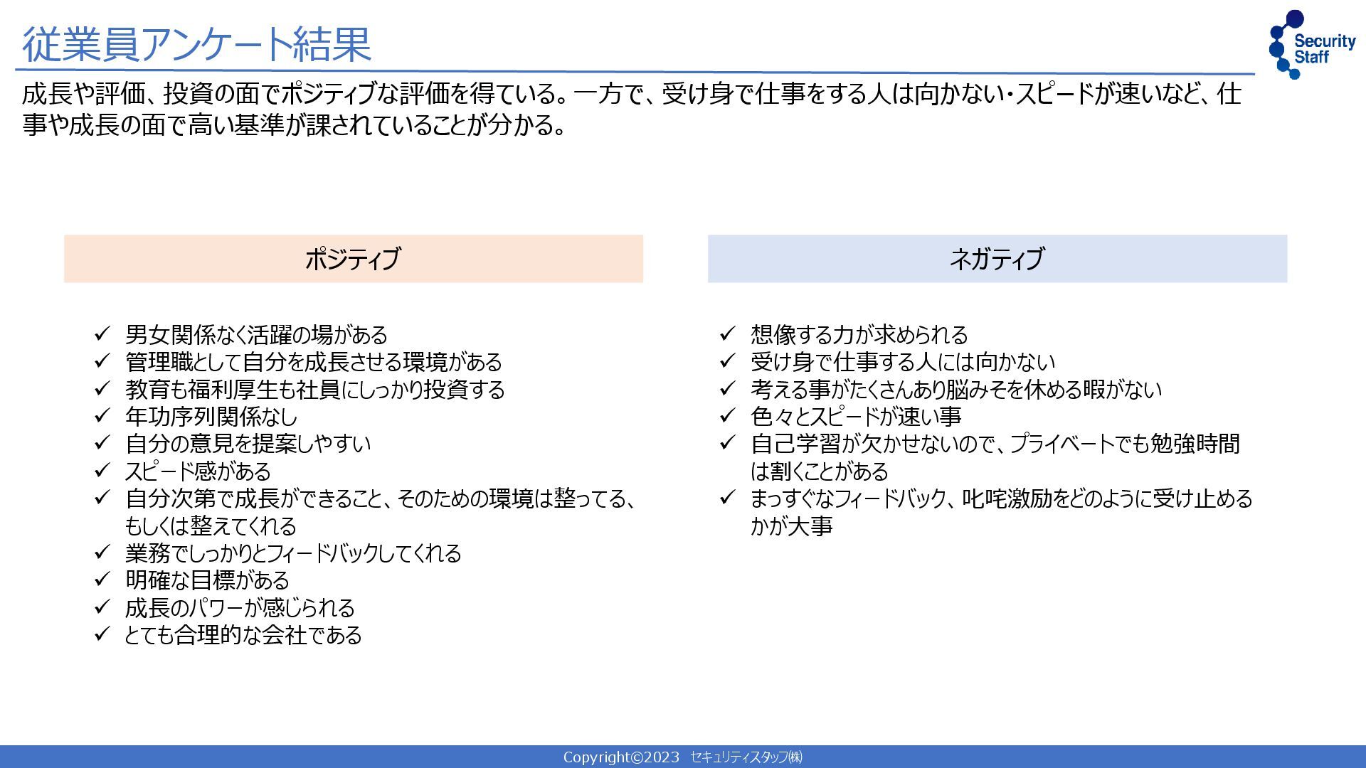11. Copyright©2023 セキュリティスタッフ㈱ 従業員アンケート結果 ポジティブ ✓ 男女関係なく活躍の場がある ✓ 管理職として自分を成長させる環境がある ✓ 教育も福利厚生も社員にしっかり投資する