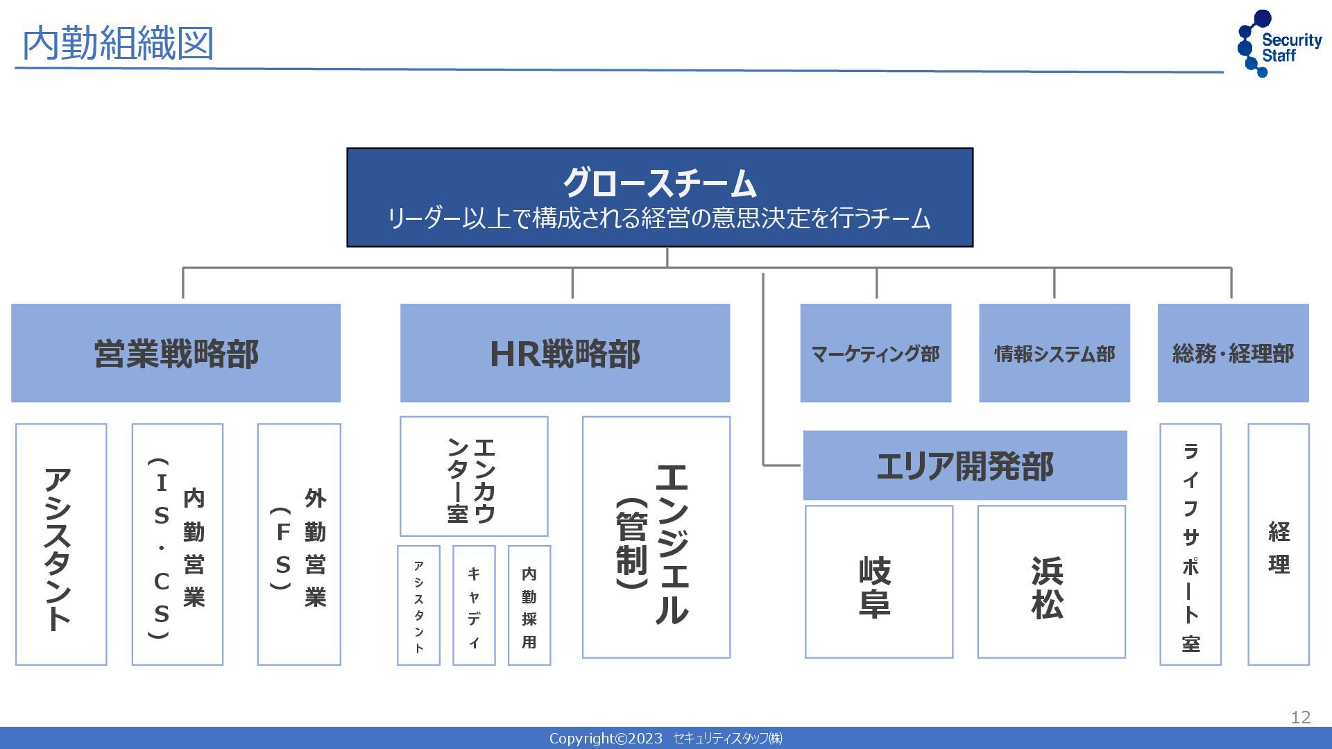 3. Copyright©2023 セキュリティスタッフ㈱ 内勤組織図 12 グロースチーム リーダー以上で構成される経営の意思決定を行うチーム 営業戦略部 HR戦略部 マーケティング部 情報システム部