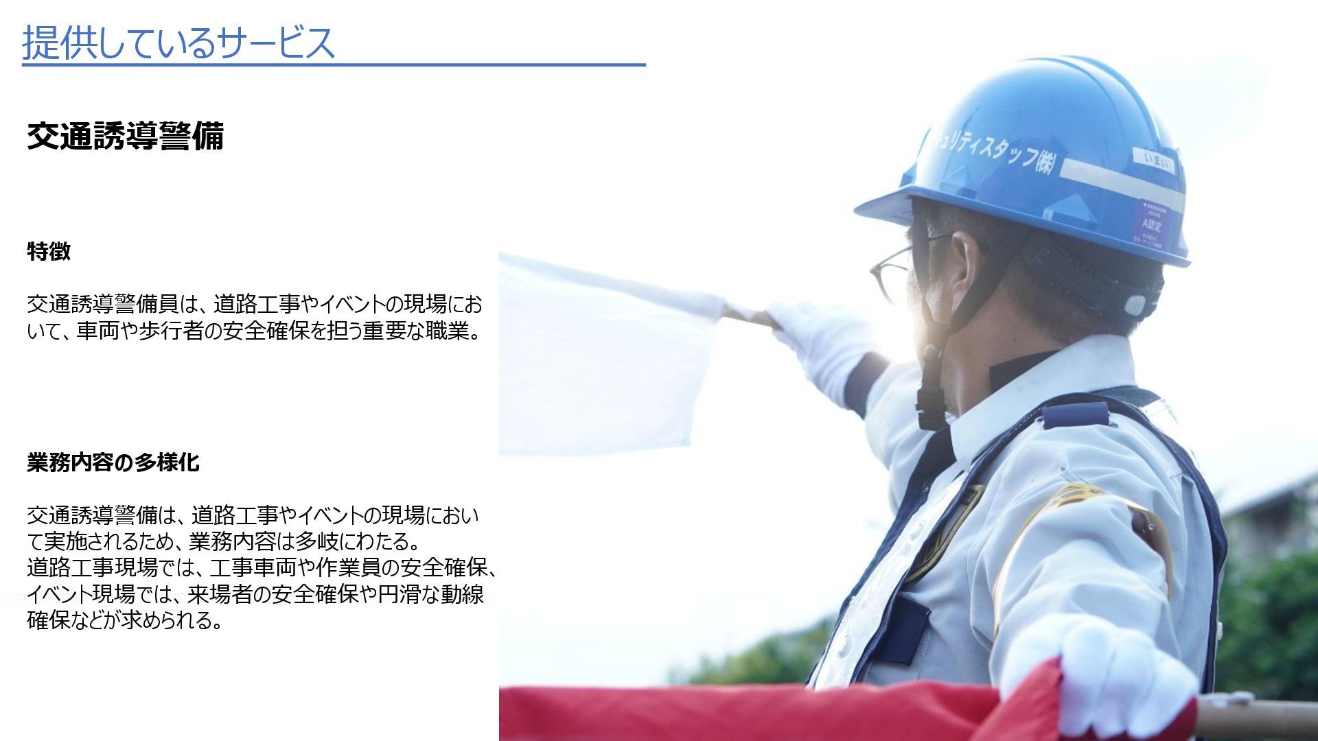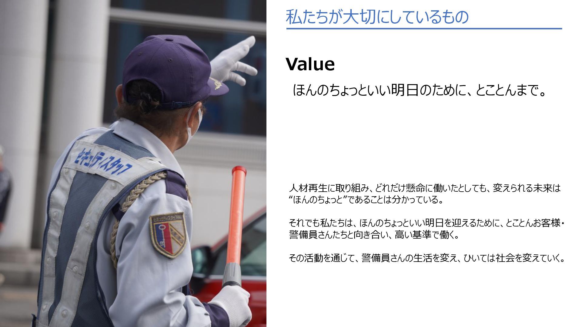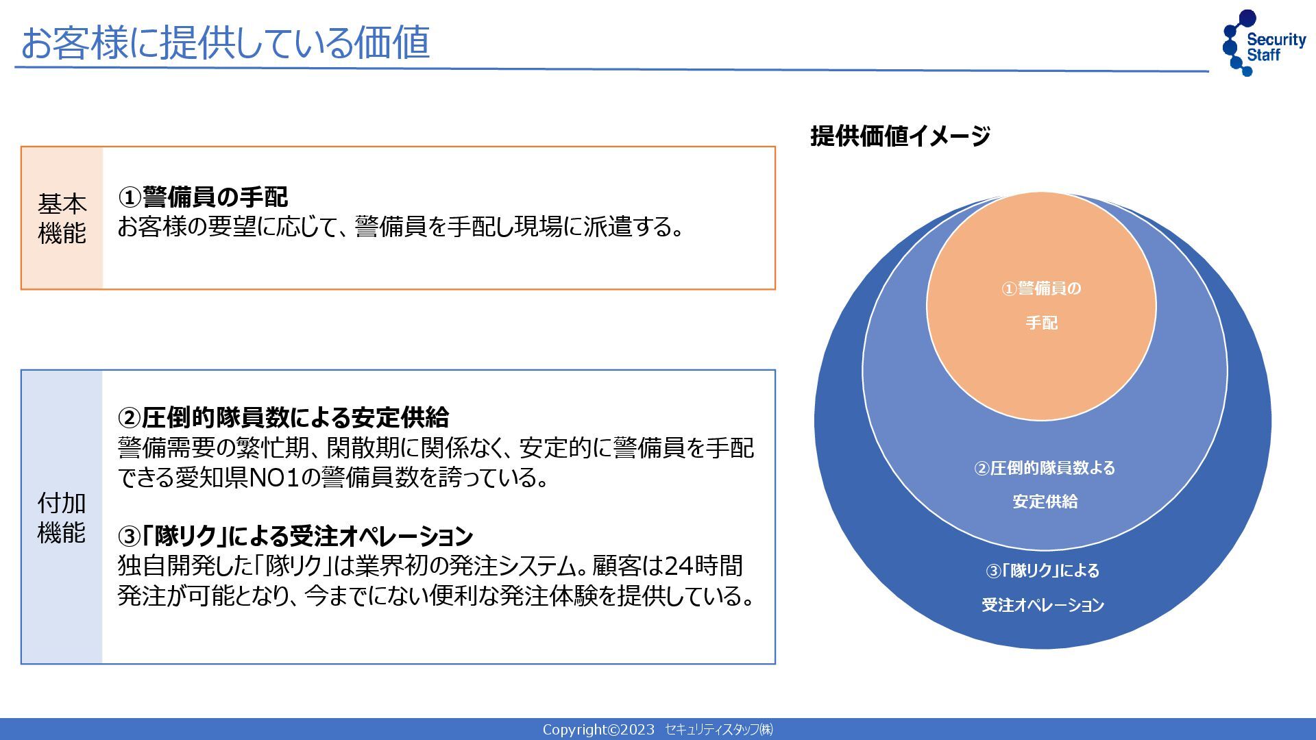 機能 ①警備員の手配 お客様の要望に応じて、警備員を手配し現場に派遣する。 付加 機能 ②圧倒的隊員数による安定供給 警備需要の繁忙期、閑散期に関係なく、安定的に警備員を手配 できる愛知県NO1の警備員数を誇っている。 ③「隊リク」による受注オペレーション 独自開発した「隊リク」は業界初の発注システム。顧客は24時間 発注が可能となり、今までにない便利な発注体験を提供している。 提供価値イメージ
