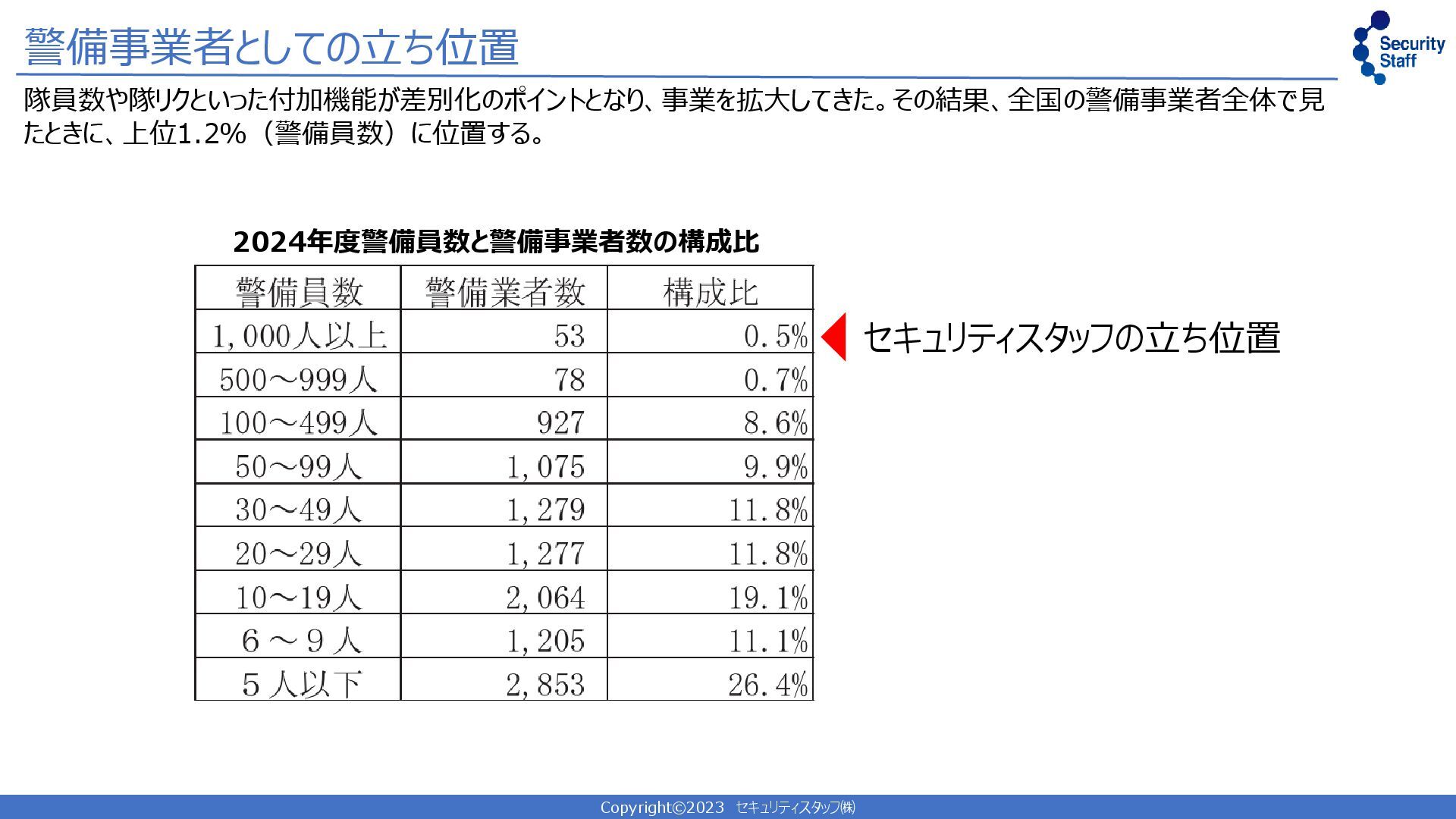5. Copyright©2023 セキュリティスタッフ㈱ お客様に提供している価値 ③「隊リク」による 受注オペレーション ②圧倒的隊員数よる 安定供給 ①警備員の 手配 基本