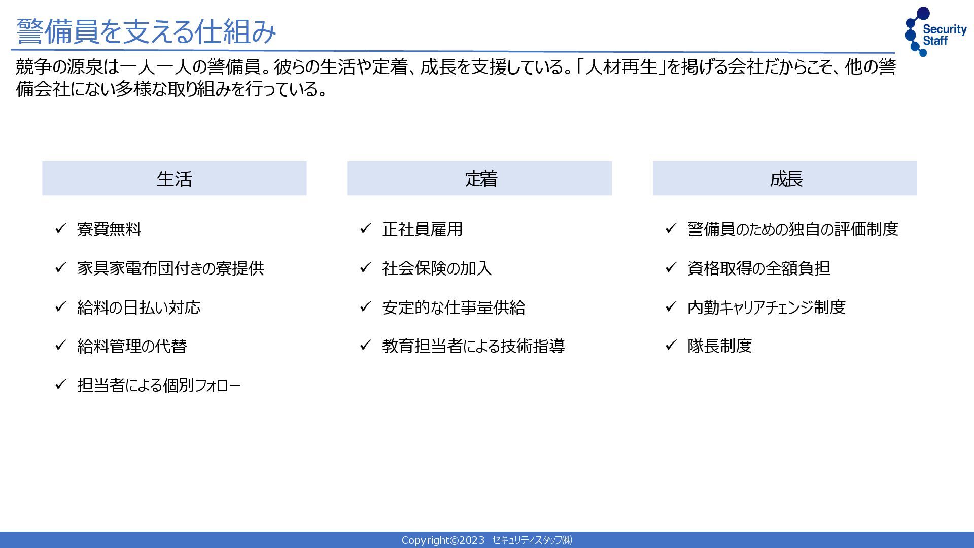 7. Copyright©2023 セキュリティスタッフ㈱ 警備員を支える仕組み 競争の源泉は一人一人の警備員。彼らの生活や定着、成長を支援している。「人材再生」を掲げる会社だからこそ、他の警 備会社にない多様な取り組みを行っている。 生活 定着 成長 ✓ 寮費無料