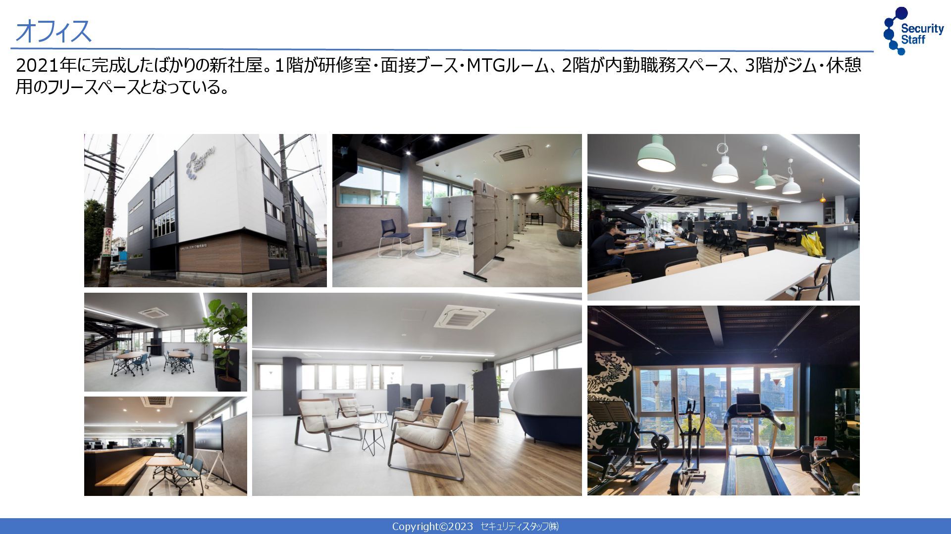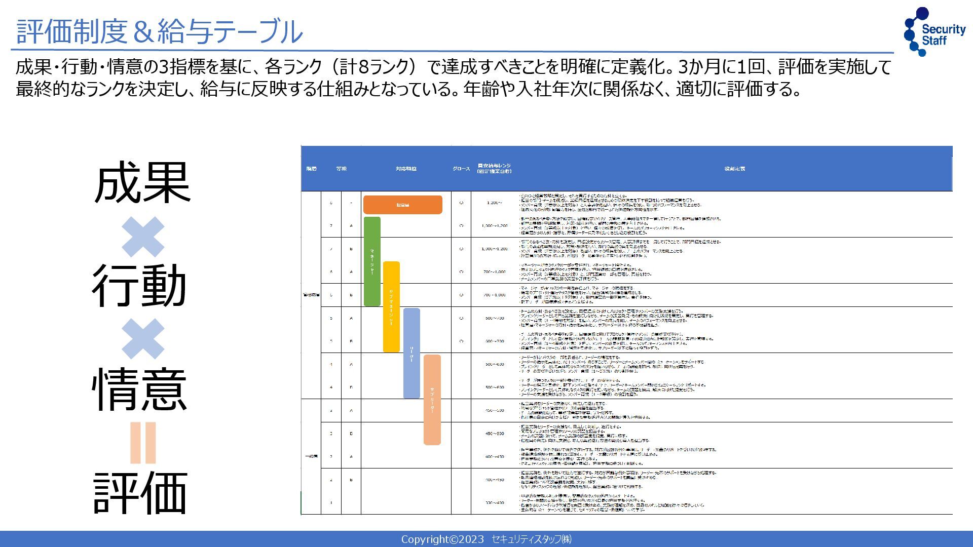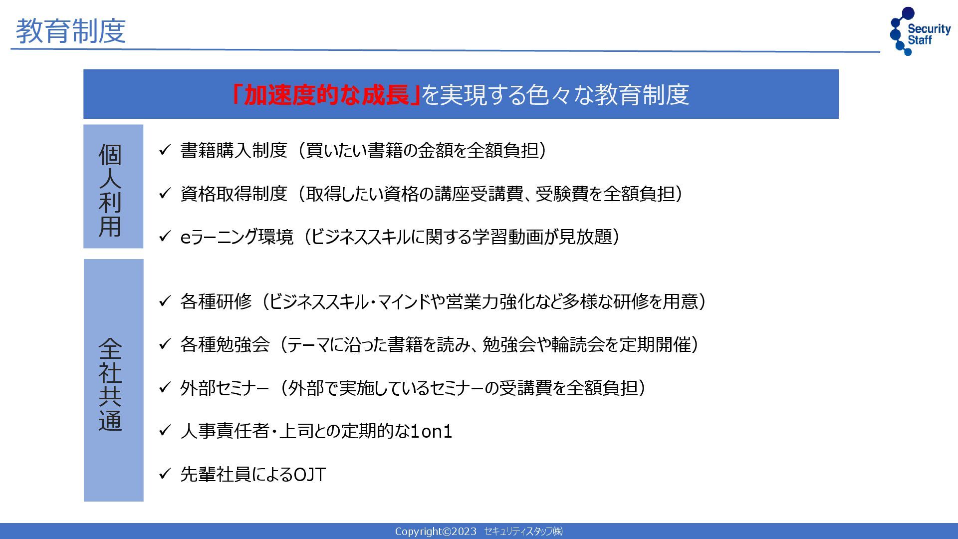 9. Copyright©2023 セキュリティスタッフ㈱ 教育制度 「加速度的な成長」を実現する色々な教育制度 ✓ 書籍購入制度(買いたい書籍の金額を全額負担) ✓ 資格取得制度(取得したい資格の講座受講費、受験費を全額負担) ✓ eラーニング環境(ビジネススキルに関する学習動画が見放題)