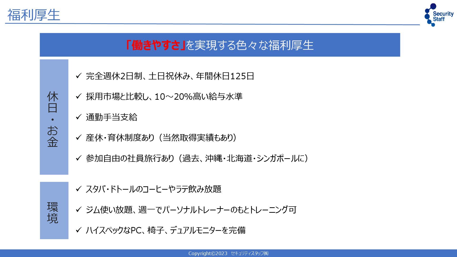 10. Copyright©2023 セキュリティスタッフ㈱ 福利厚生 「働きやすさ」を実現する色々な福利厚生 ✓ 完全週休2日制、土日祝休み、年間休日125日 ✓ 採用市場と比較し、10~20%高い給与水準 ✓ 通勤手当支給