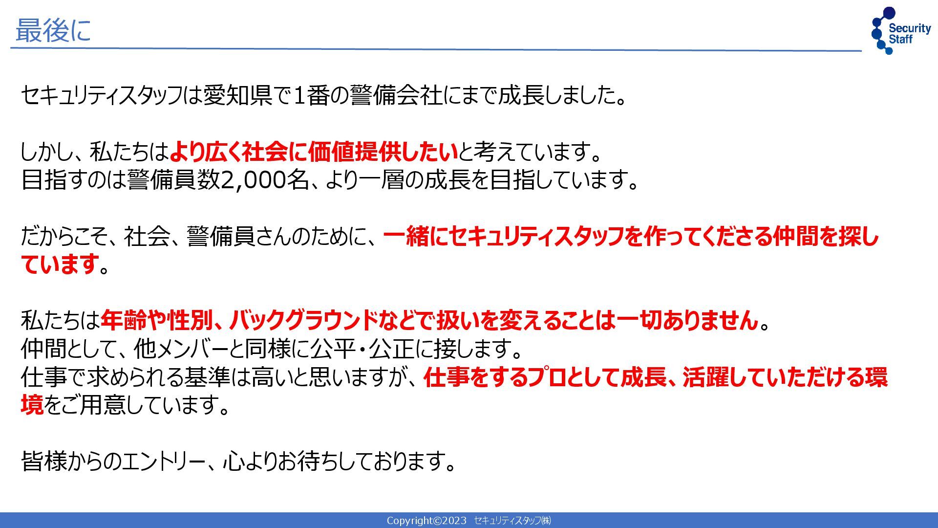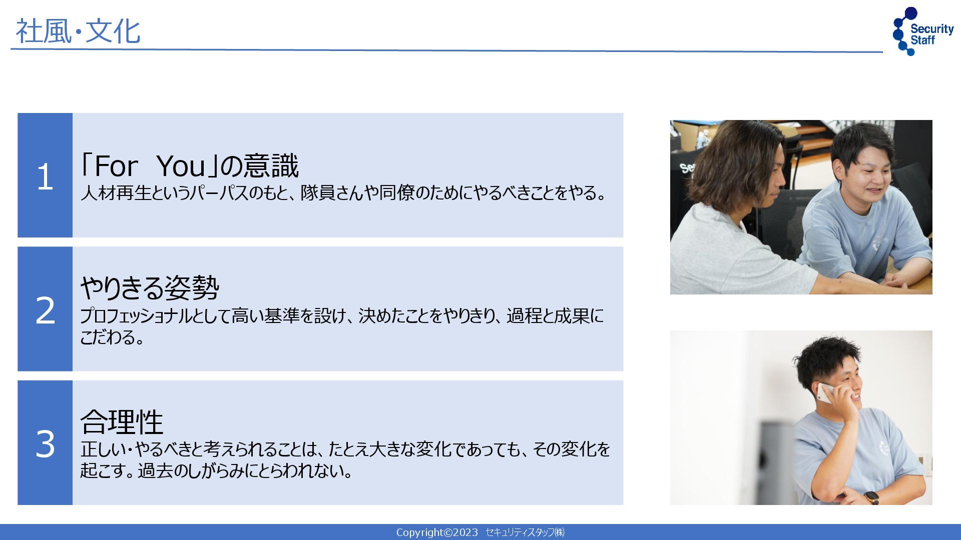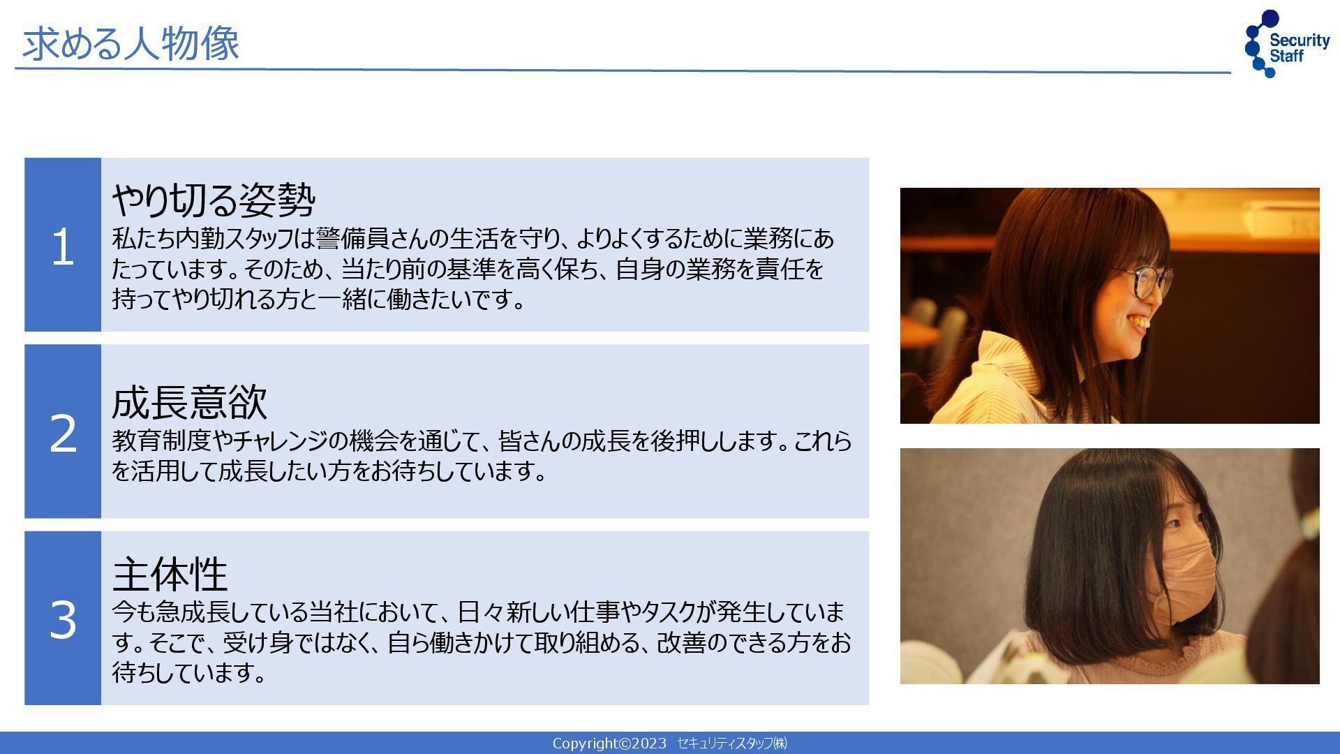 12. Copyright©2023 セキュリティスタッフ㈱ 求める人物像 1 やり切る姿勢 私たち内勤スタッフは警備員さんの生活を守り、よりよくするために業務にあ たっています。そのため、当たり前の基準を高く保ち、自身の業務を責任を 持ってやり切れる方と一緒に働きたいです。 2 成長意欲
