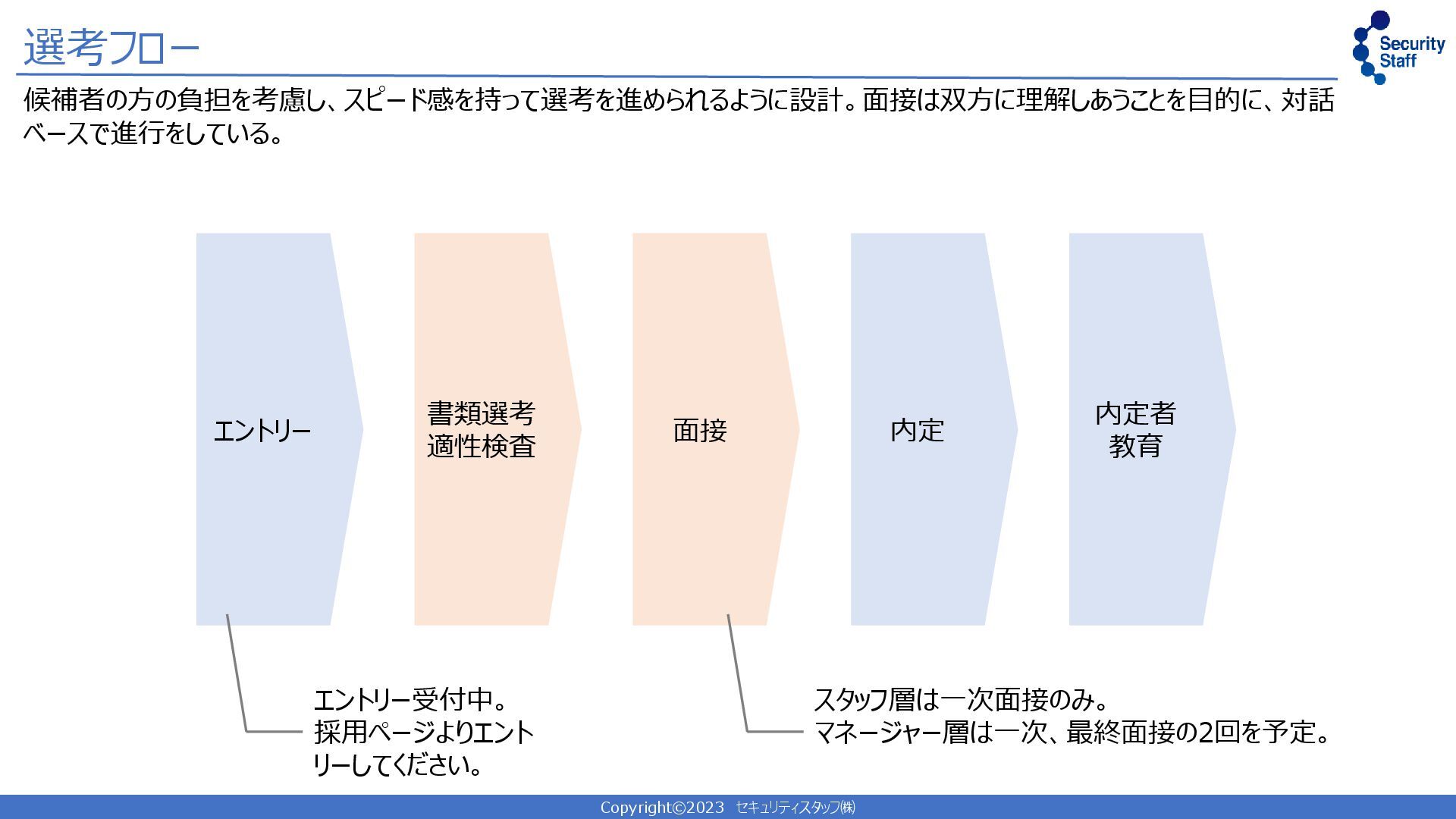 13. Copyright©2023 セキュリティスタッフ㈱ 選考フロー エントリー 書類選考 適性検査 面接 内定 内定者 教育