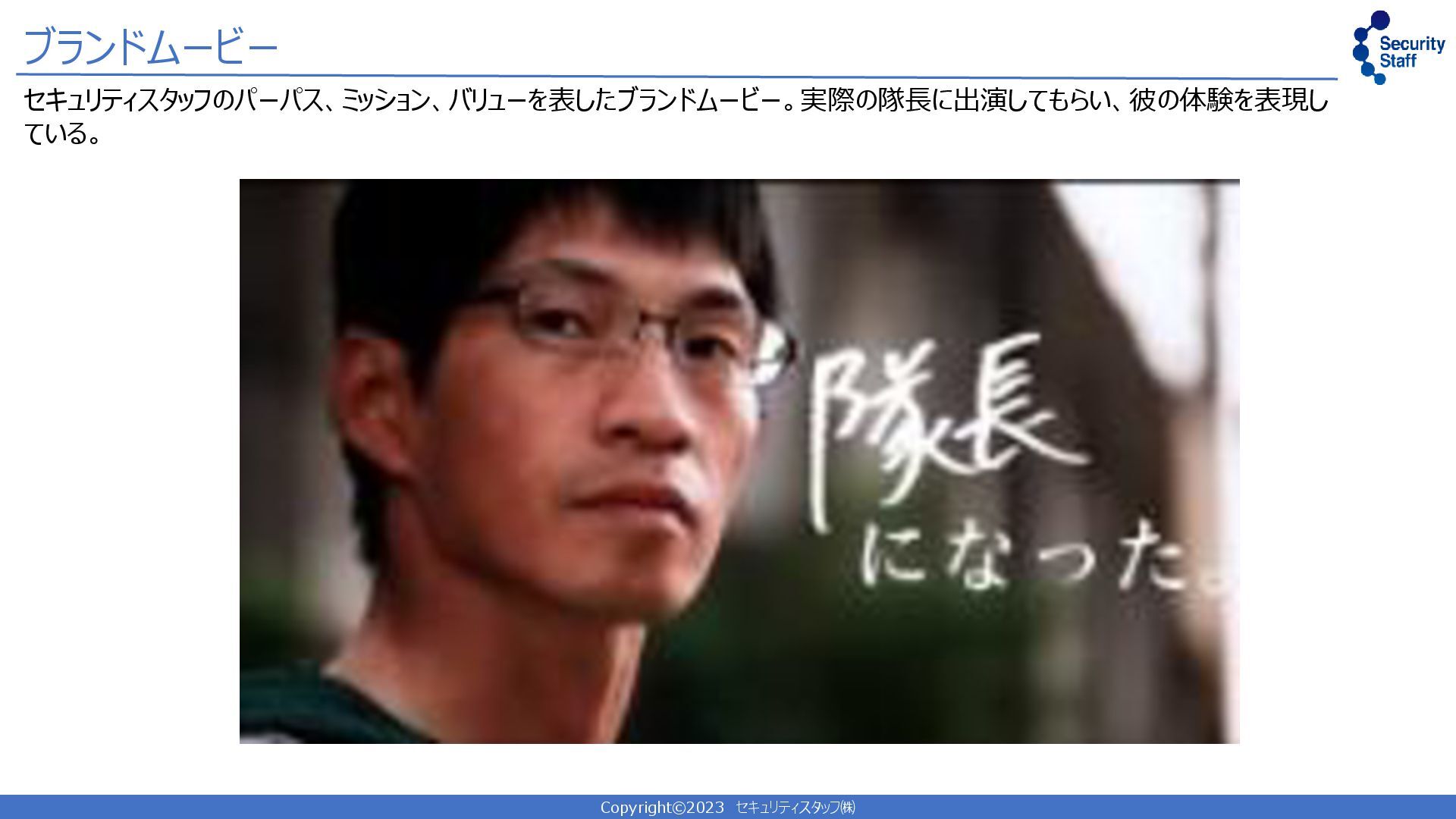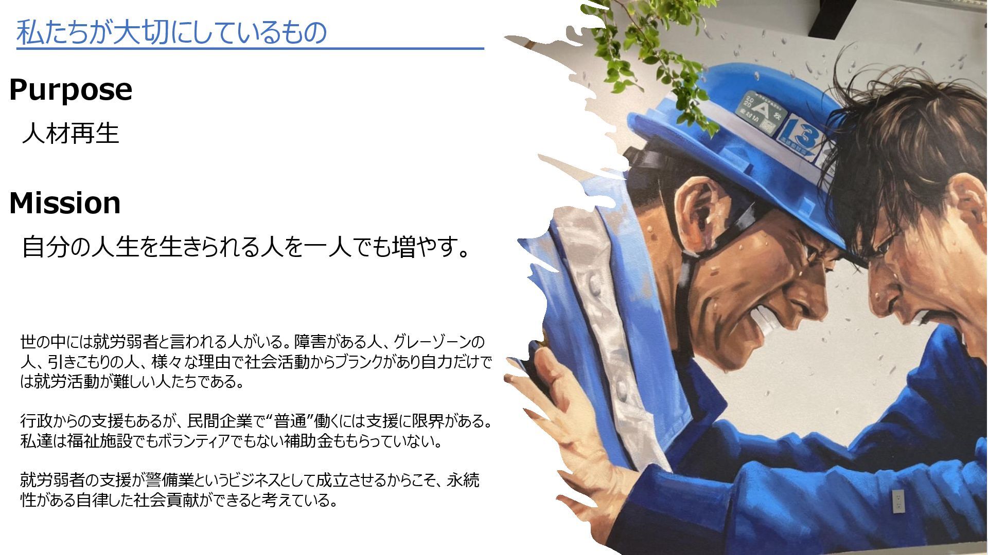 1. Copyright©2023 セキュリティスタッフ㈱ 私たちが大切にしているもの Purpose 人材再生 Mission 自分の人生を生きられる人を一人でも増やす。 世の中には就労弱者と言われる人がいる。障害がある人、グレーゾーンの 人、引きこもりの人、様々な理由で社会活動からブランクがあり自力だけで は就労活動が難しい人たちである。