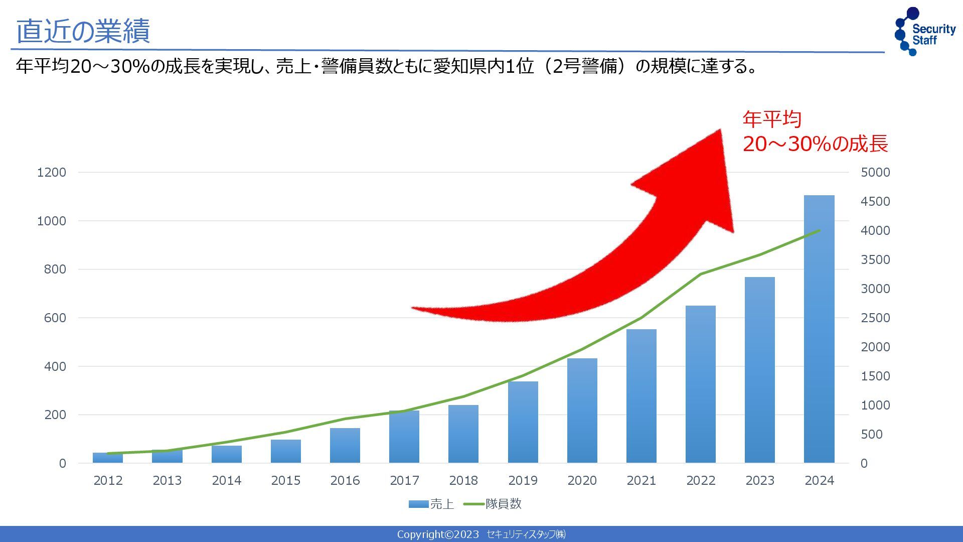 3000 3500 4000 4500 5000 0 200 400 600 800 1000 1200 2012 2013 2014 2015 2016 2017 2018 2019 2020 2021 2022 2023 2024 売上 隊員数 年平均 20~30%の成長