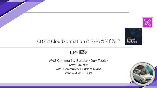 CDKとCloudFormationどちらが好み? 山本 直弥 AWS Community Builder (Dev Tools) JAWS-UG 東京