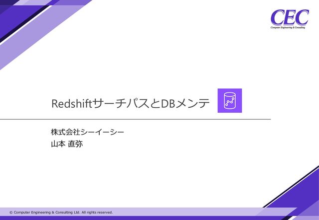 reserved. [サーチパスの確認] show search_path [サーチパスの変更] alter user [ユーザ] set search_path to [スキーマ1,スキーマ2] 例: [サーチパス]公開スキーマ,非公開スキーマ SELECT * FROM テーブルA; →(公開スキーマの)テーブルA ※同名テーブルは最初に書かれたスキーマを優先し て検索する SELECT * FROM 非公開スキーマ.テーブルB; → (非公開スキーマの)テーブルB ※スキーマを指定してテーブル参照も可能 SELECT * FROM テーブルD; →(非公開スキーマの)テーブルD ※テーブルがある最初のスキーマを参照する ◼ サーチパスとは? → スキーマ参照の優先順位