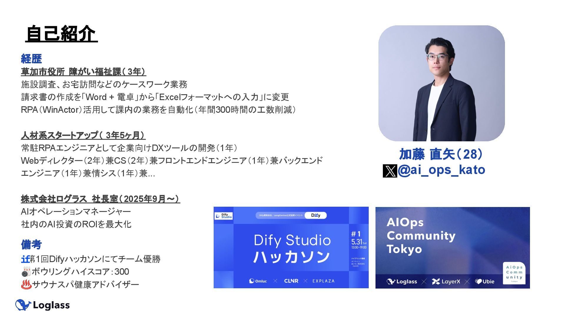 3年5ヶ月) 常駐RPAエンジニアとして企業向けDXツールの開発(1年) Webディレクター(2年)兼CS(2年)兼フロントエンドエンジニア(1年)兼バックエンド エンジニア(1年)兼情シス(1年)兼... 株式会社ログラス 社長室(2025年9月〜) AIオペレーションマネージャー 社内のAI投資のROIを最大化 備考 第1回Difyハッカソンにてチーム優勝 🎳ボウリングハイスコア:300 ♨サウナスパ健康アドバイザー 加藤 直矢(28) @ai_ops_kato 自己紹介