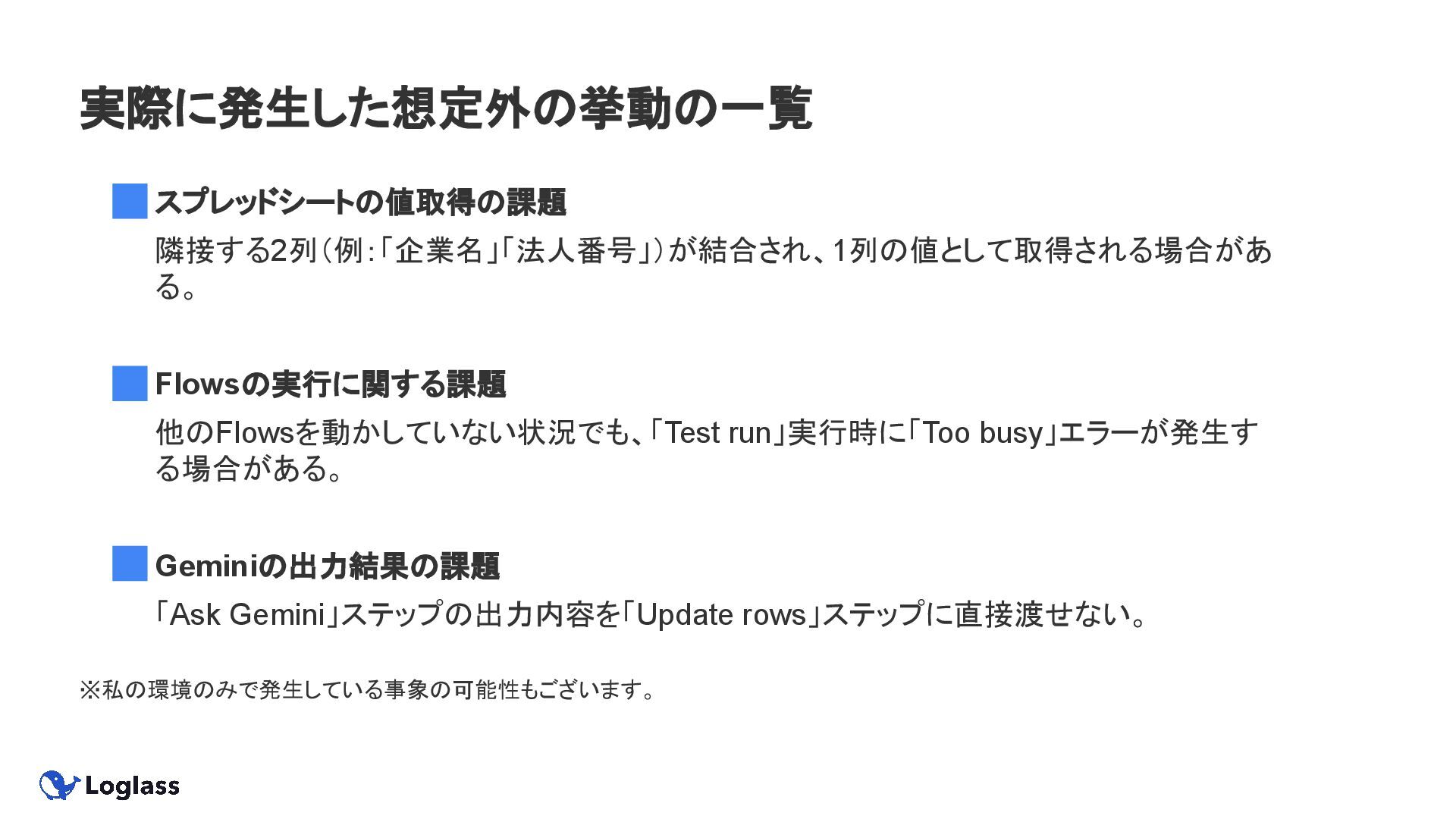 実際に発生した想定外の挙動の一覧 ※私の環境のみで発生している事象の可能性もございます。 スプレッドシートの値取得の課題 隣接する2列(例:「企業名」「法人番号」)が結合され、1列の値として取得される場合があ る。 Flowsの実行に関する課題 他のFlowsを動かしていない状況でも、「Test run」実行時に「Too busy」エラーが発生す る場合がある。