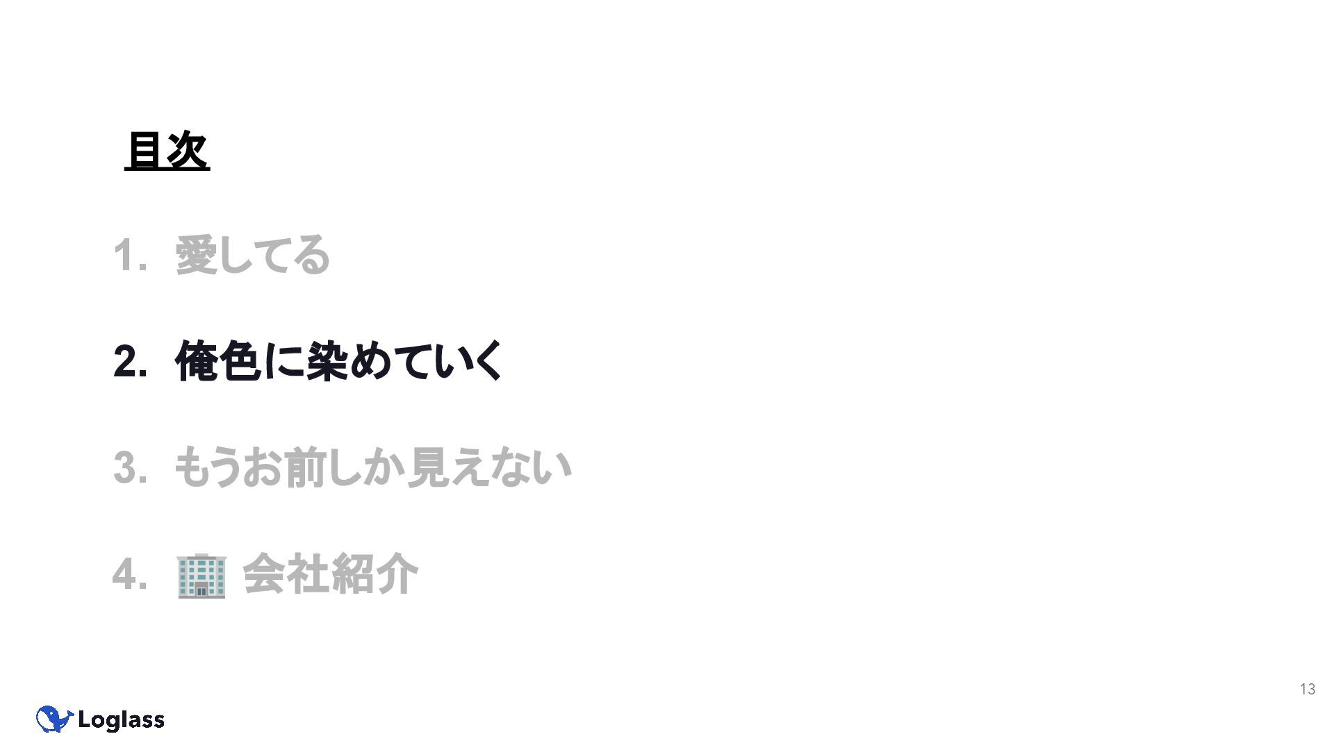 13 1. 愛してる 2. 俺色に染めていく 3. もうお前しか見えない 4. 🏢 会社紹介