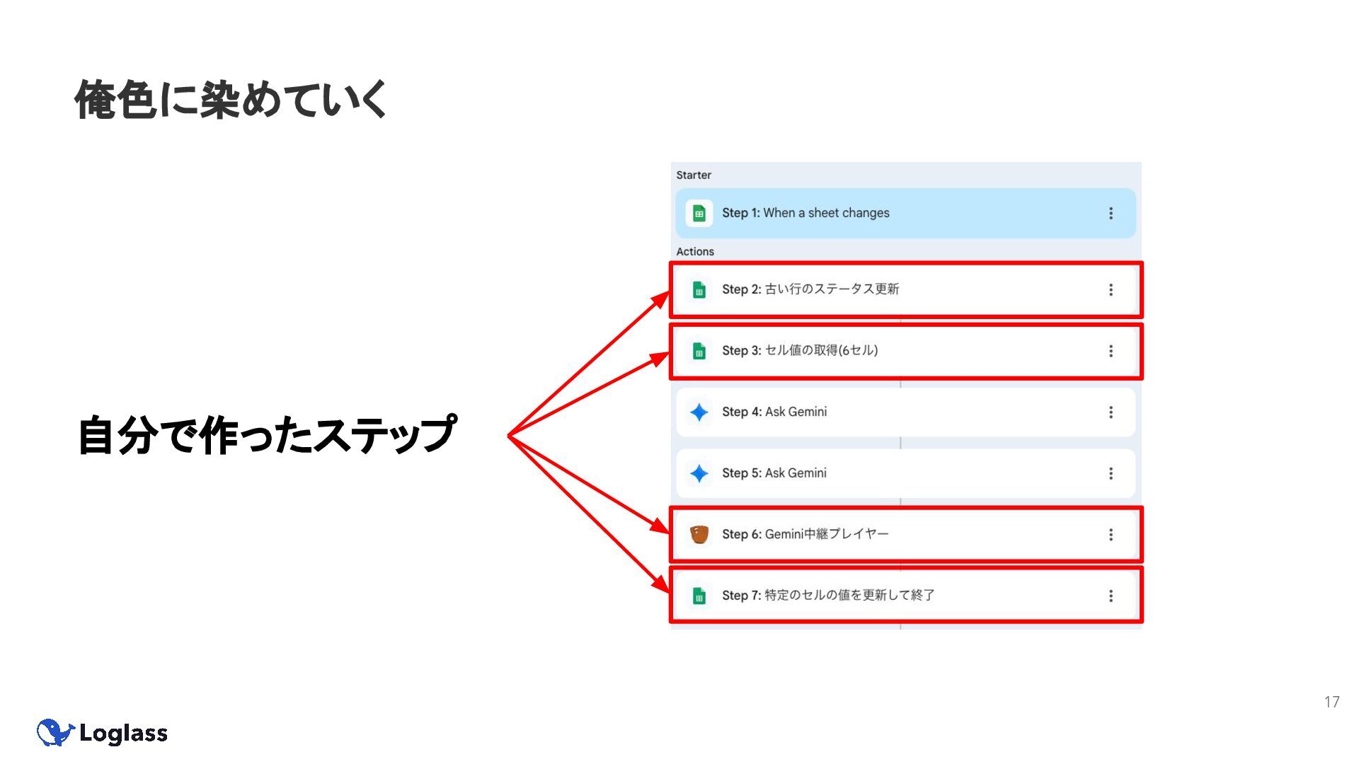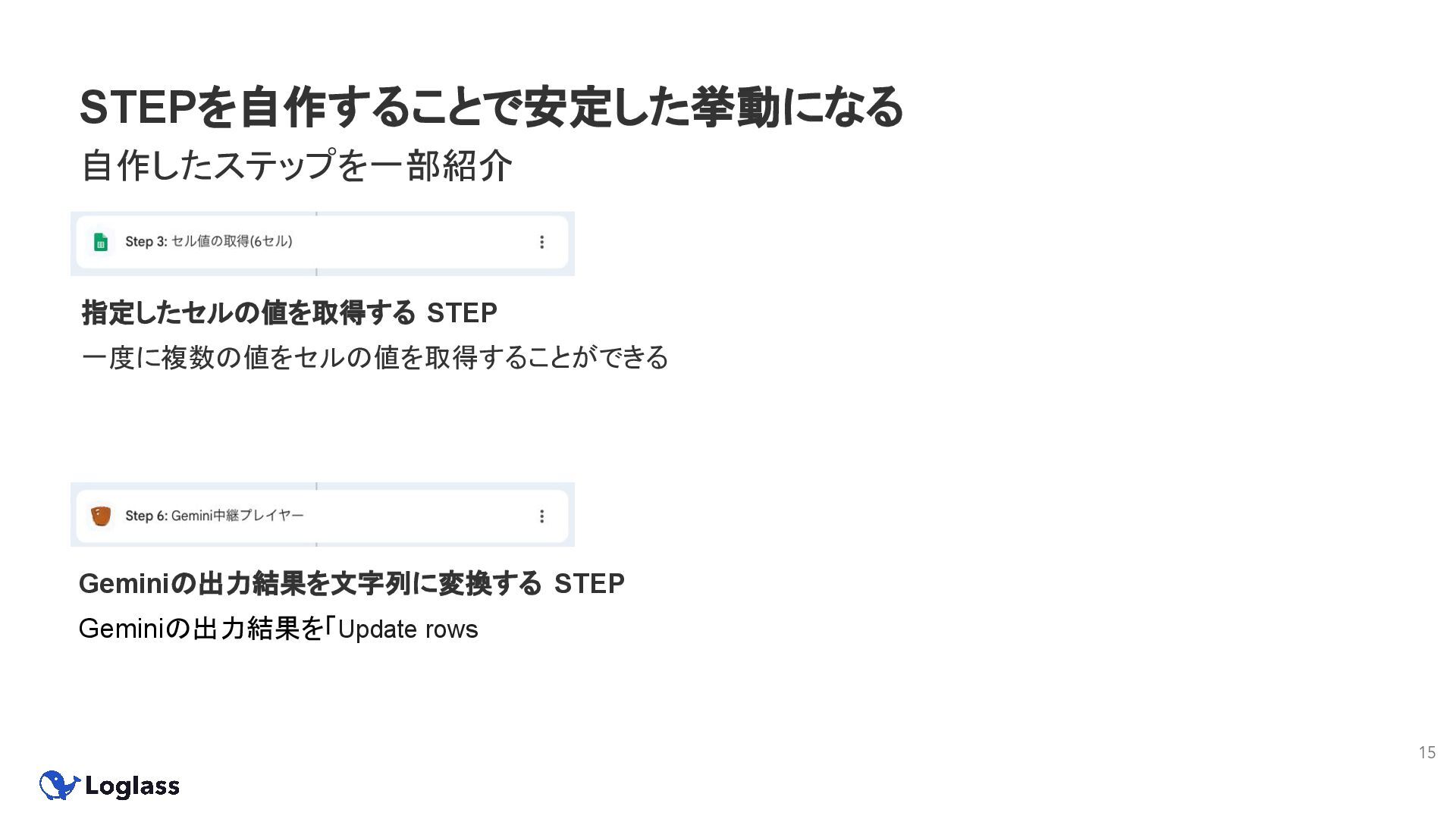 15 STEPを自作することで安定した挙動になる 自作したステップを一部紹介 指定したセルの値を取得する STEP 一度に複数の値をセルの値を取得することができる Geminiの出力結果を文字列に変換する STEP Geminiの出力結果を「Update rows