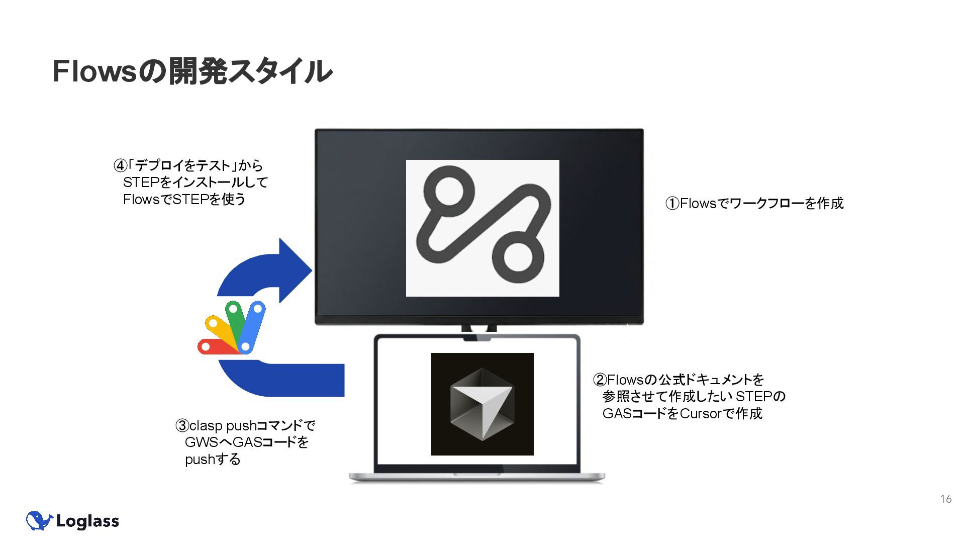 16 Flowsの開発スタイル ②Flowsの公式ドキュメントを 参照させて作成したい STEPの GASコードをCursorで作成 ①Flowsでワークフローを作成 ③clasp pushコマンドで GWSへGASコードを
