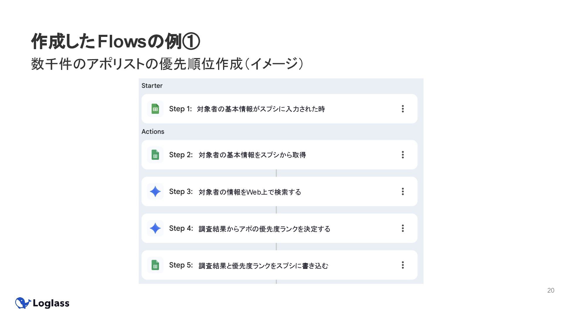 20 作成したFlowsの例① 数千件のアポリストの優先順位作成(イメージ) 対象者の基本情報がスプシに入力された時 対象者の基本情報をスプシから取得 対象者の情報をWeb上で検索する 調査結果からアポの優先度ランクを決定する 調査結果と優先度ランクをスプシに書き込む