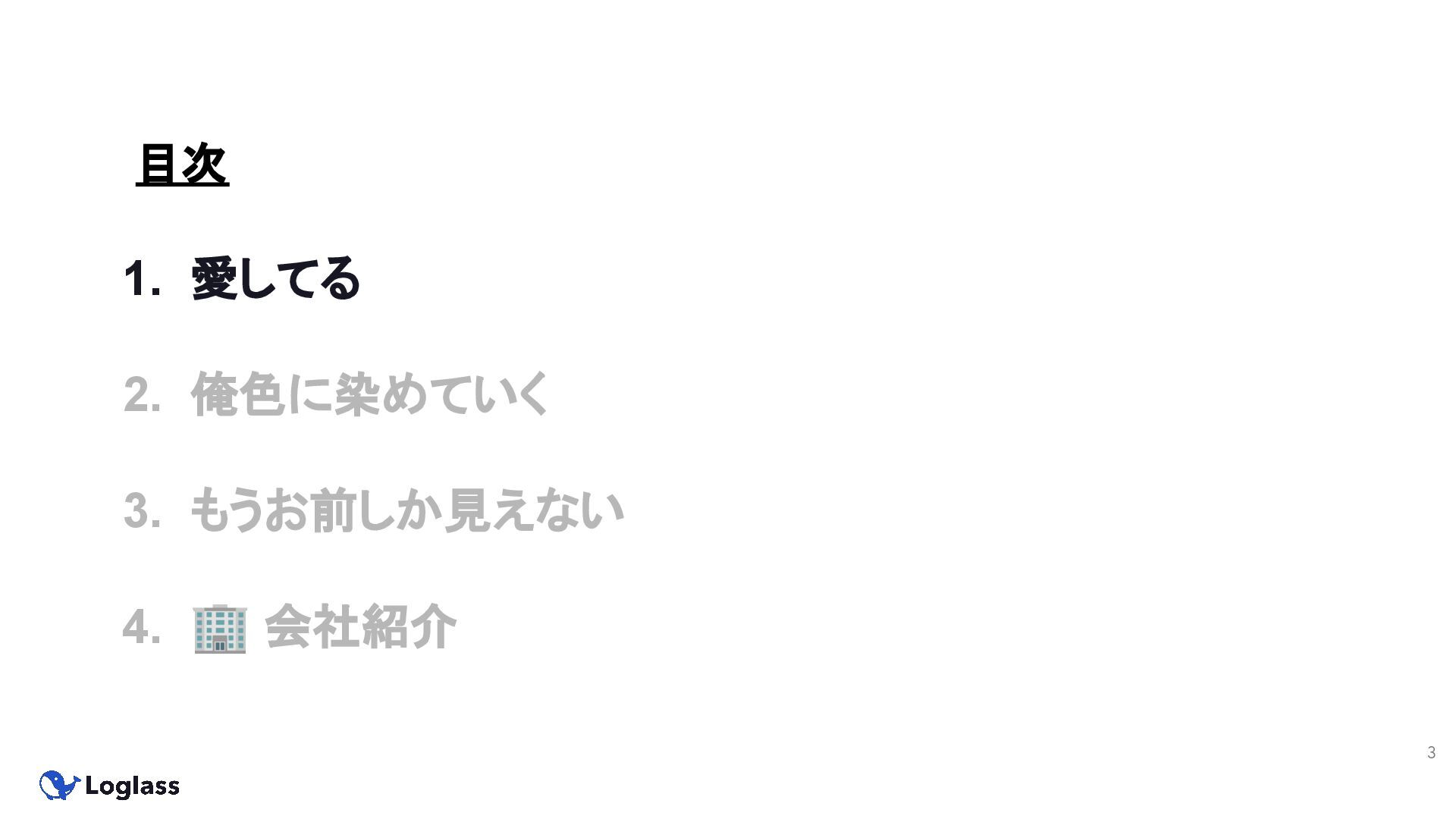 3 1. 愛してる 2. 俺色に染めていく 3. もうお前しか見えない 4. 🏢 会社紹介
