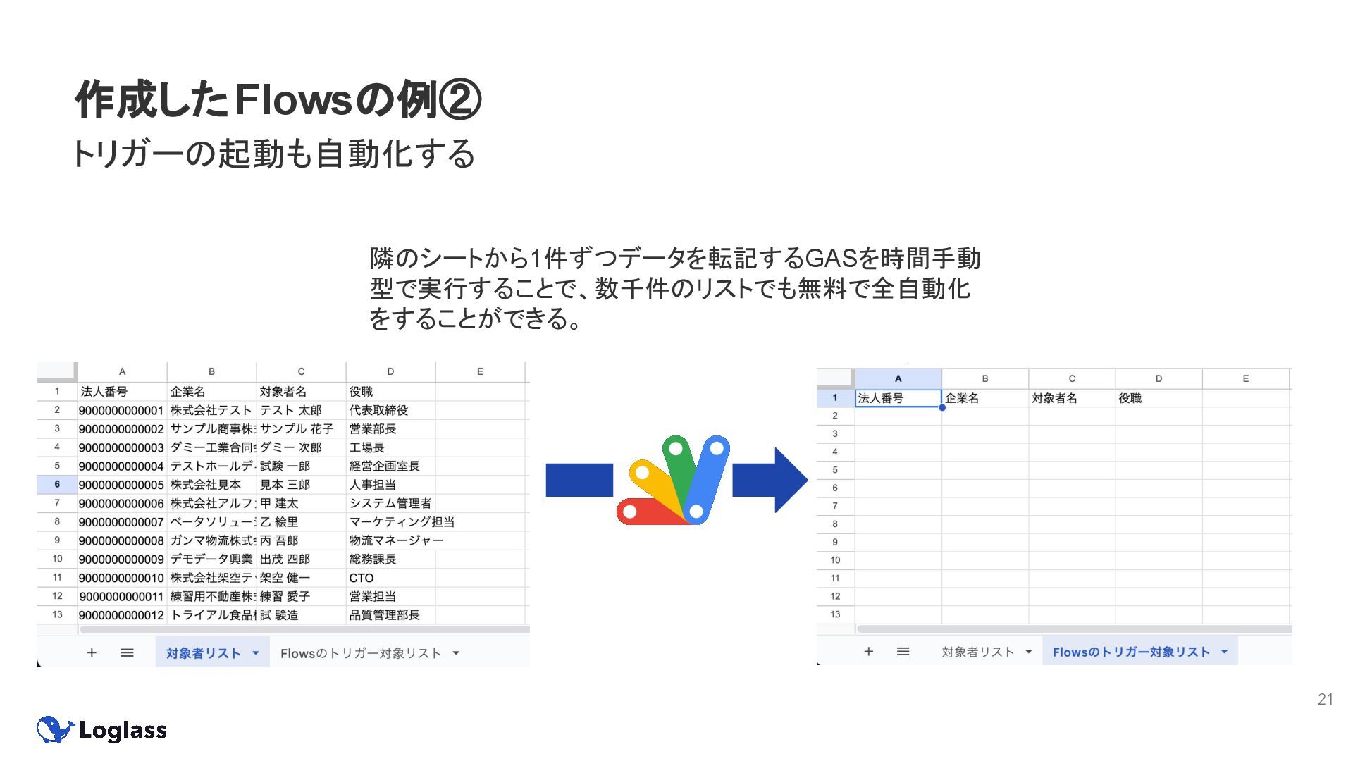 21 作成したFlowsの例② トリガーの起動も自動化する 隣のシートから1件ずつデータを転記するGASを時間手動 型で実行することで、数千件のリストでも無料で全自動化 をすることができる。