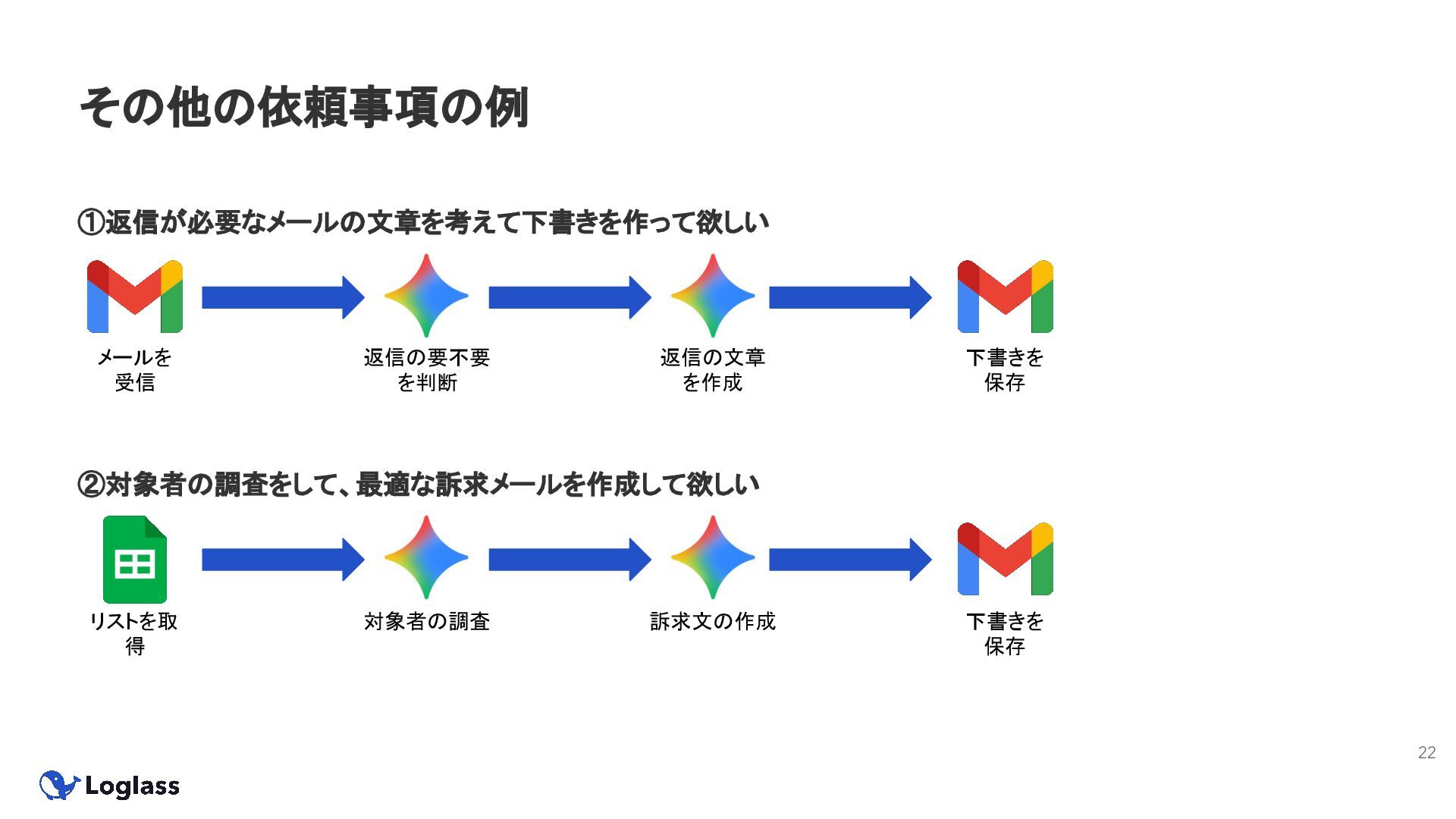 22 その他の依頼事項の例 ①返信が必要なメールの文章を考えて下書きを作って欲しい ②対象者の調査をして、最適な訴求メールを作成して欲しい メールを 受信 返信の要不要 を判断 返信の文章 を作成