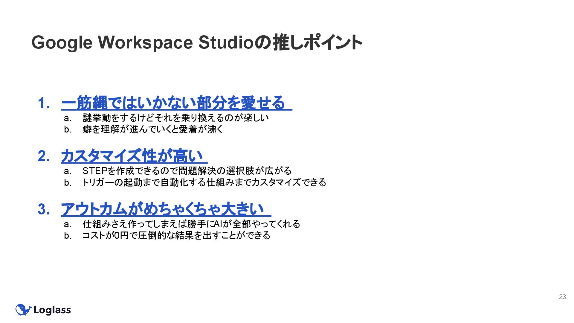 STEPを作成できるので問題解決の選択肢が広がる b. トリガーの起動まで自動化する仕組みまでカスタマイズできる 3. アウトカムがめちゃくちゃ大きい a. 仕組みさえ作ってしまえば勝手に AIが全部やってくれる b. コストが0円で圧倒的な結果を出すことができる Google Workspace Studioの推しポイント