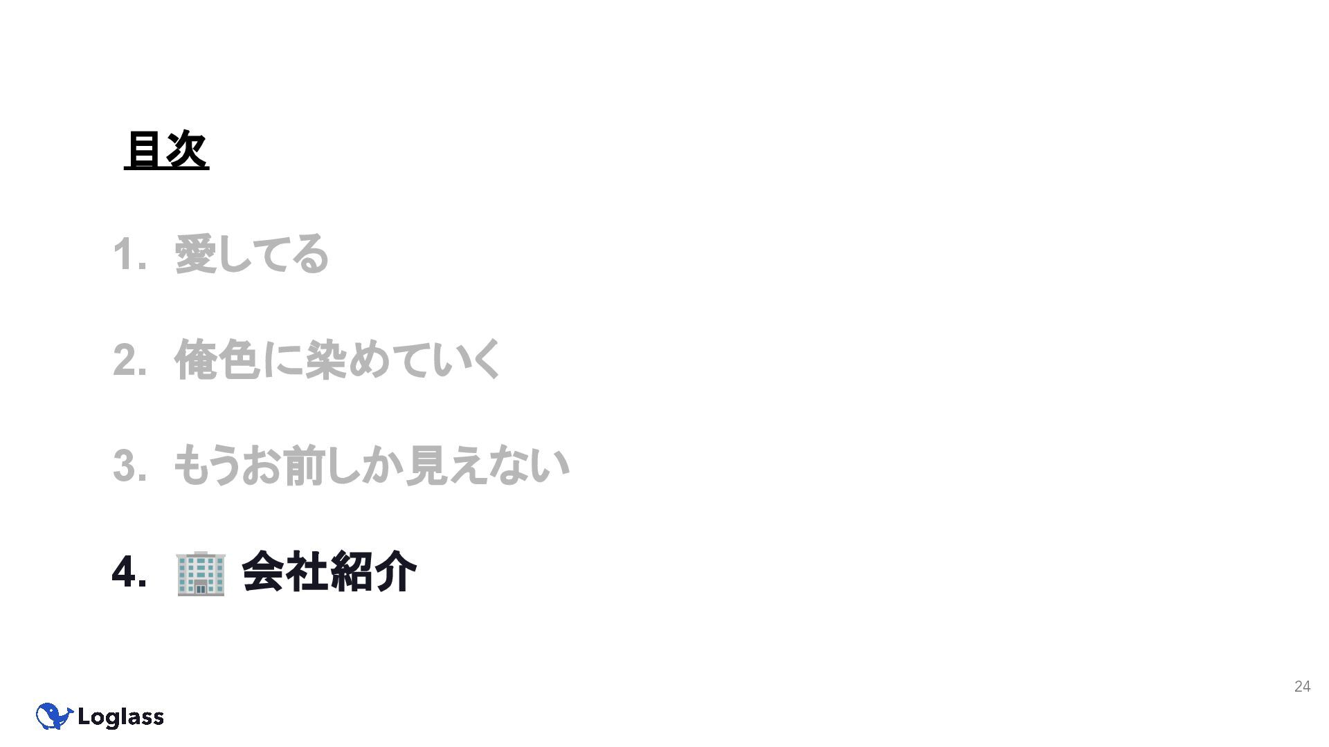 24 1. 愛してる 2. 俺色に染めていく 3. もうお前しか見えない 4. 🏢 会社紹介