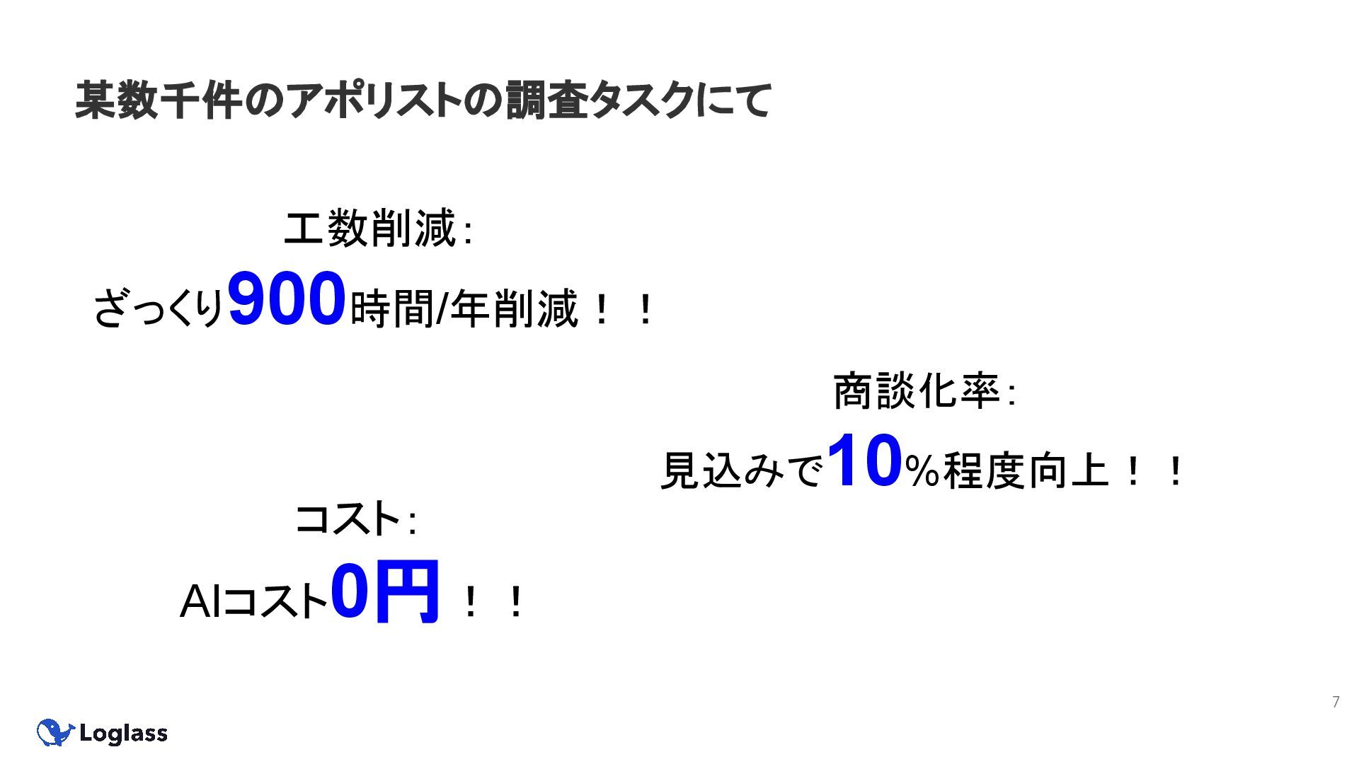 7 某数千件のアポリストの調査タスクにて 工数削減: ざっくり 900時間/年削減!! 商談化率: 見込みで 10%程度向上!! コスト: AIコスト