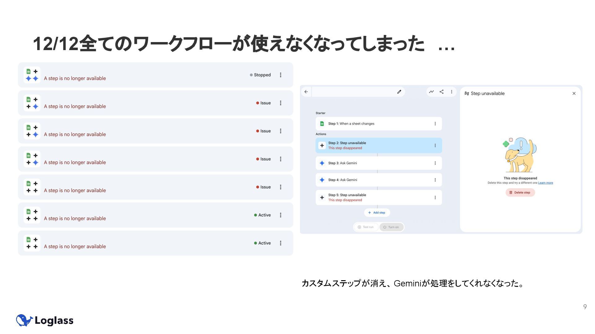 9 12/12全てのワークフローが使えなくなってしまった … カスタムステップが消え、 Geminiが処理をしてくれなくなった。