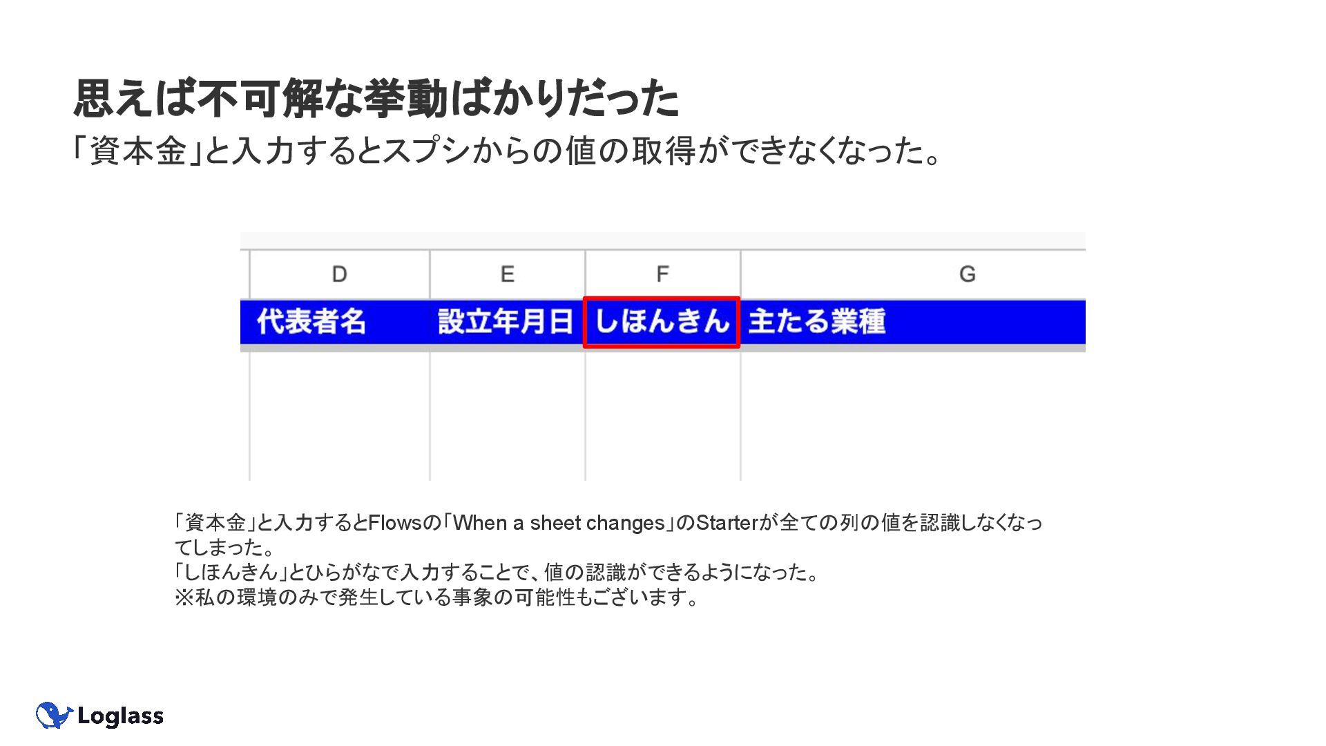 思えば不可解な挙動ばかりだった 「資本金」と入力するとスプシからの値の取得ができなくなった。 「資本金」と入力するとFlowsの「When a sheet changes」のStarterが全ての列の値を認識しなくなっ てしまった。 「しほんきん」とひらがなで入力することで、値の認識ができるようになった。 ※私の環境のみで発生している事象の可能性もございます。