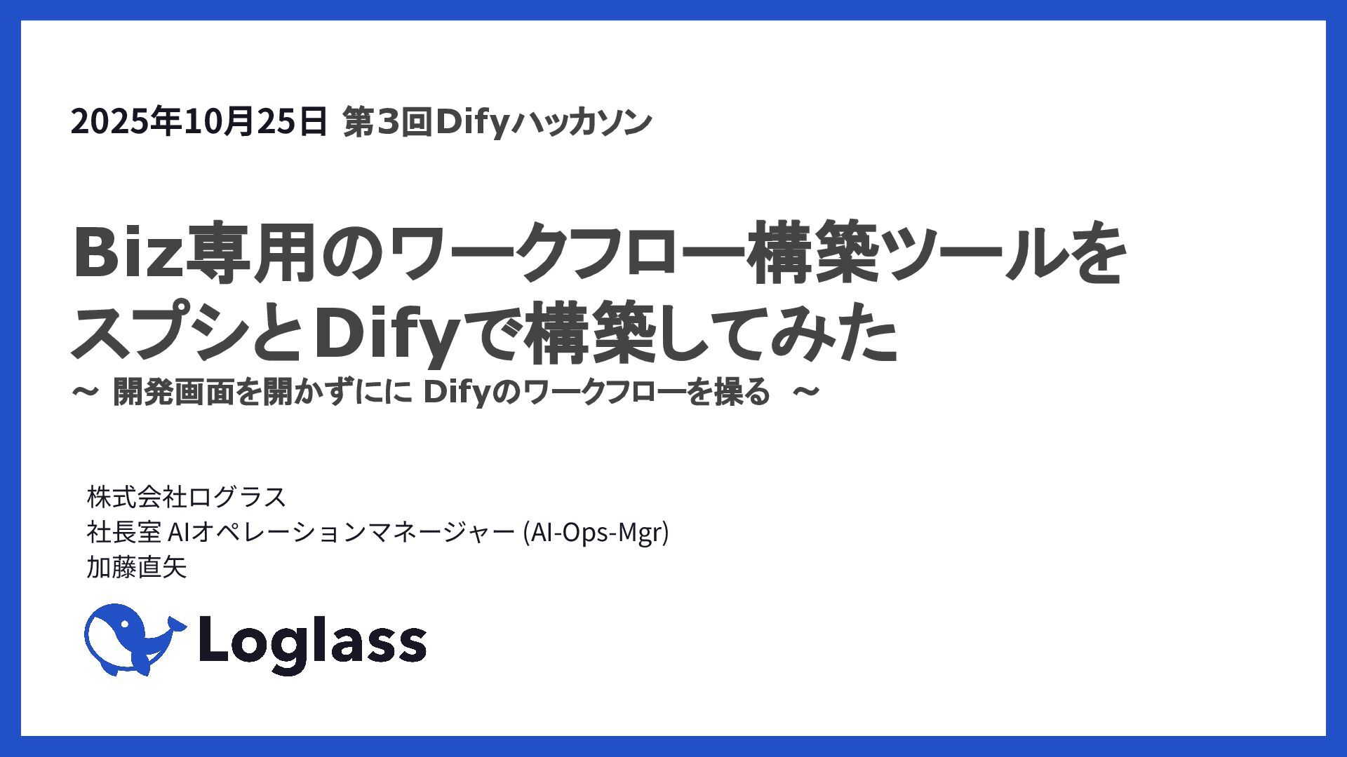 株式会社ログラス 社⻑室 AIオペレーションマネージャー (AI-Ops-Mgr) 加藤直⽮ 2025年10⽉25⽇ 第3回Difyハッカソン 1 Biz専用のワークフロー構築ツールを スプシとDifyで構築してみた