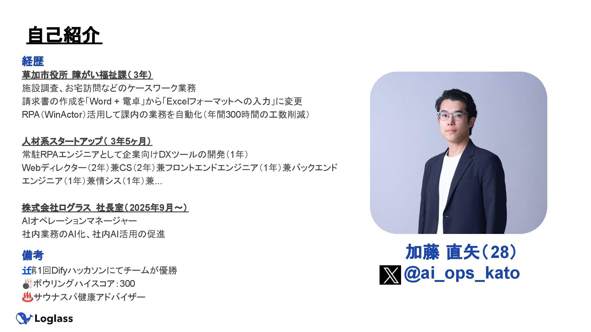 3年5ヶ月) 常駐RPAエンジニアとして企業向けDXツールの開発(1年) Webディレクター(2年)兼CS(2年)兼フロントエンドエンジニア(1年)兼バックエンド エンジニア(1年)兼情シス(1年)兼... 株式会社ログラス 社長室(2025年9月〜) AIオペレーションマネージャー 社内業務のAI化、社内AI活用の促進 備考 第1回Difyハッカソンにてチームが優勝 🎳ボウリングハイスコア:300 ♨サウナスパ健康アドバイザー 加藤 直矢(28) @ai_ops_kato 自己紹介