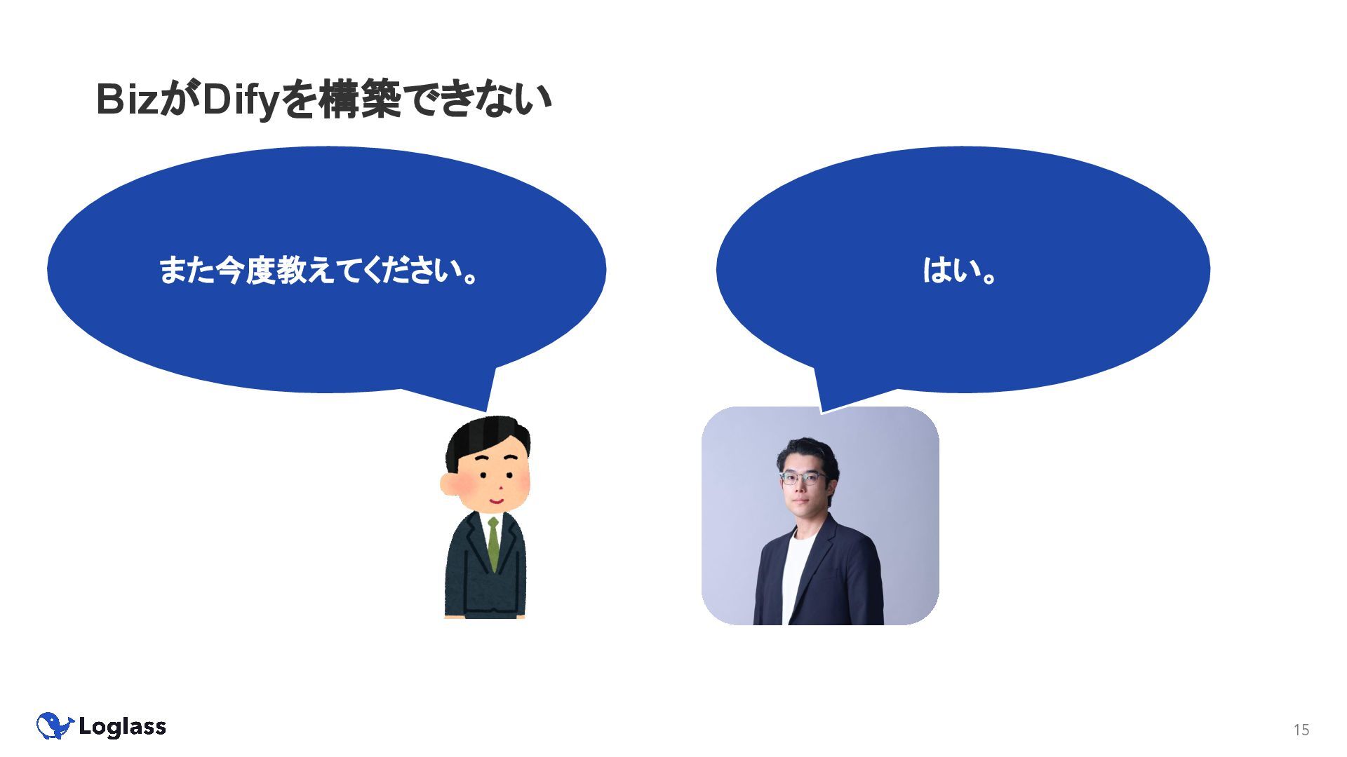 15 また今度教えてください。 はい。 BizがDifyを構築できない