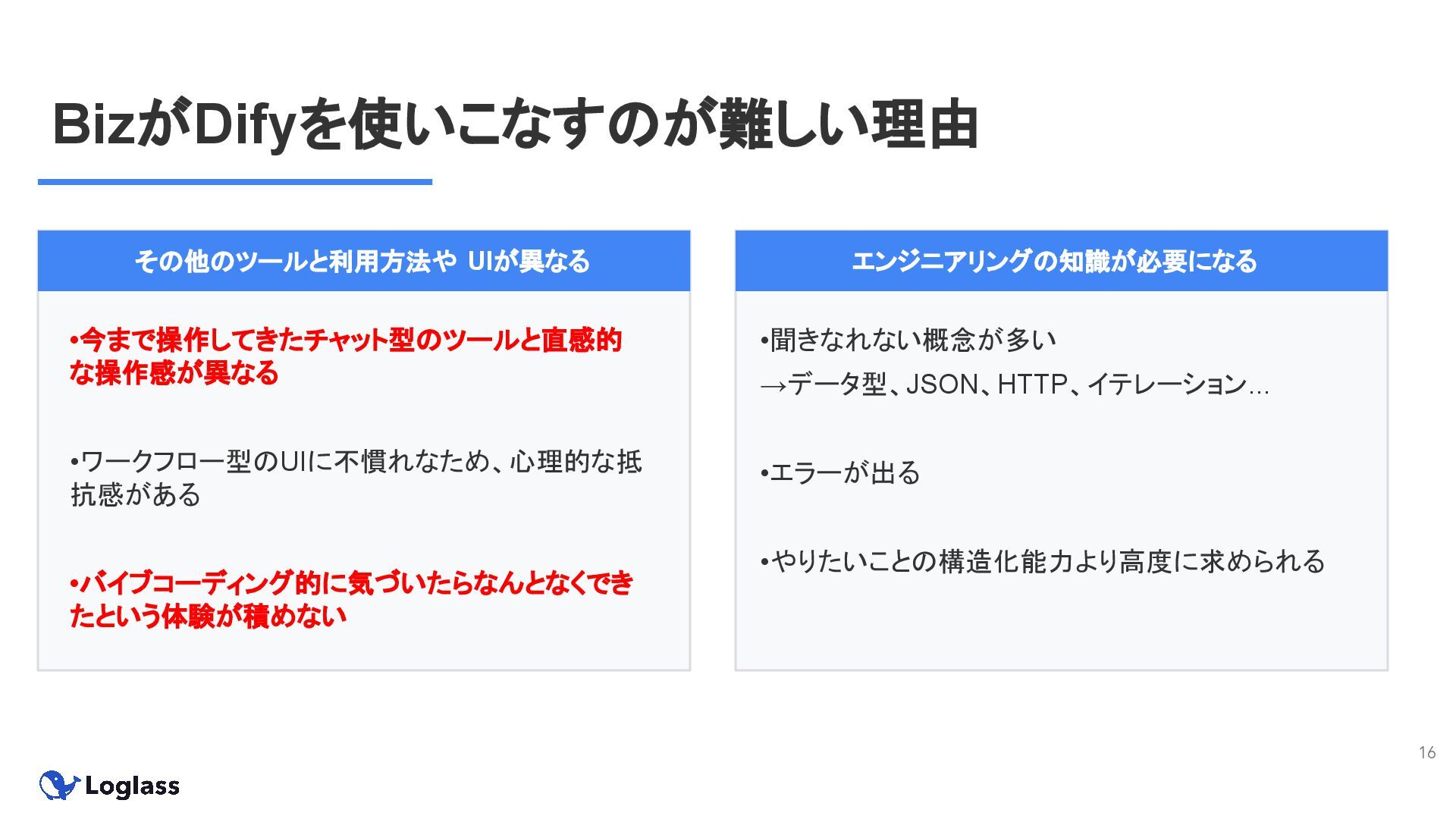 16 BizがDifyを使いこなすのが難しい理由 その他のツールと利用方法や UIが異なる •今まで操作してきたチャット型のツールと直感的 な操作感が異なる •ワークフロー型のUIに不慣れなため、心理的な抵 抗感がある •バイブコーディング的に気づいたらなんとなくでき たという体験が積めない