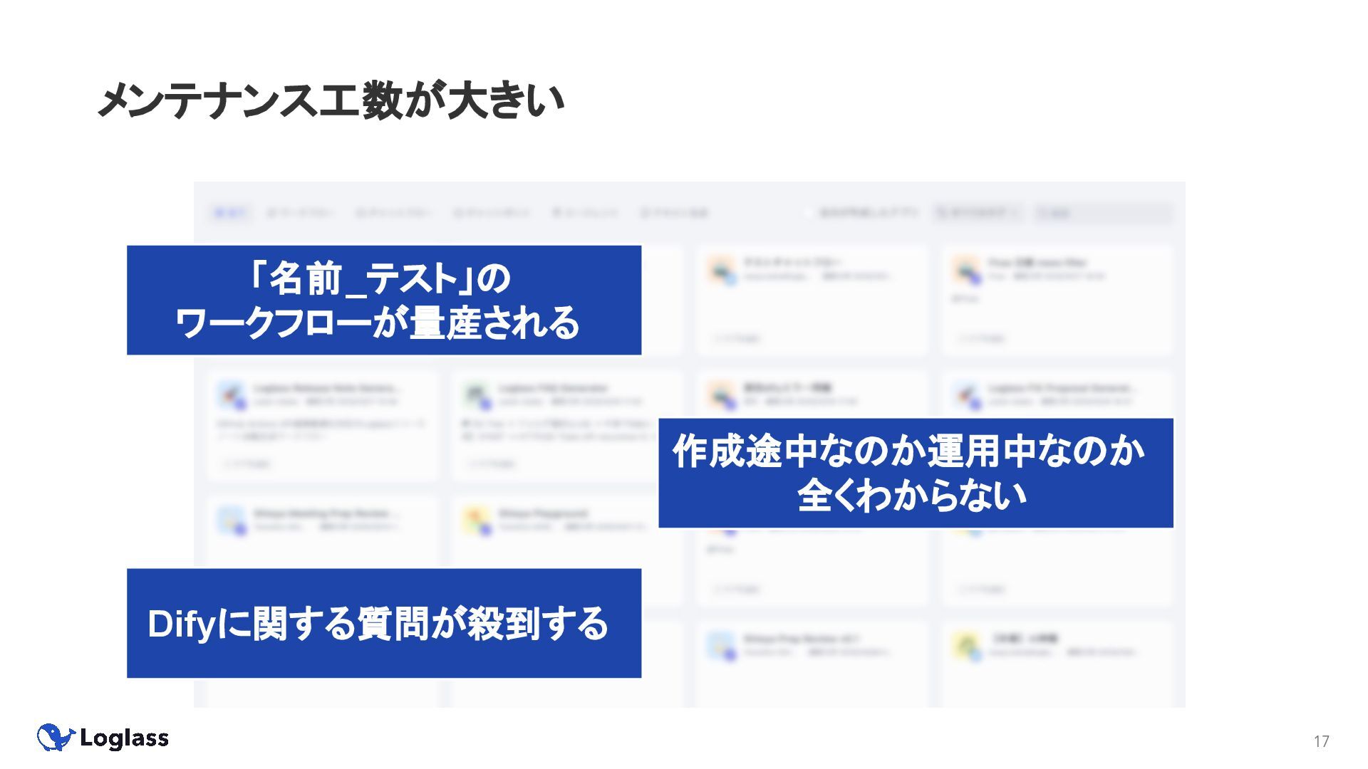 17 「名前_テスト」の ワークフローが量産される メンテナンス工数が大きい 作成途中なのか運用中なのか 全くわからない Difyに関する質問が殺到する