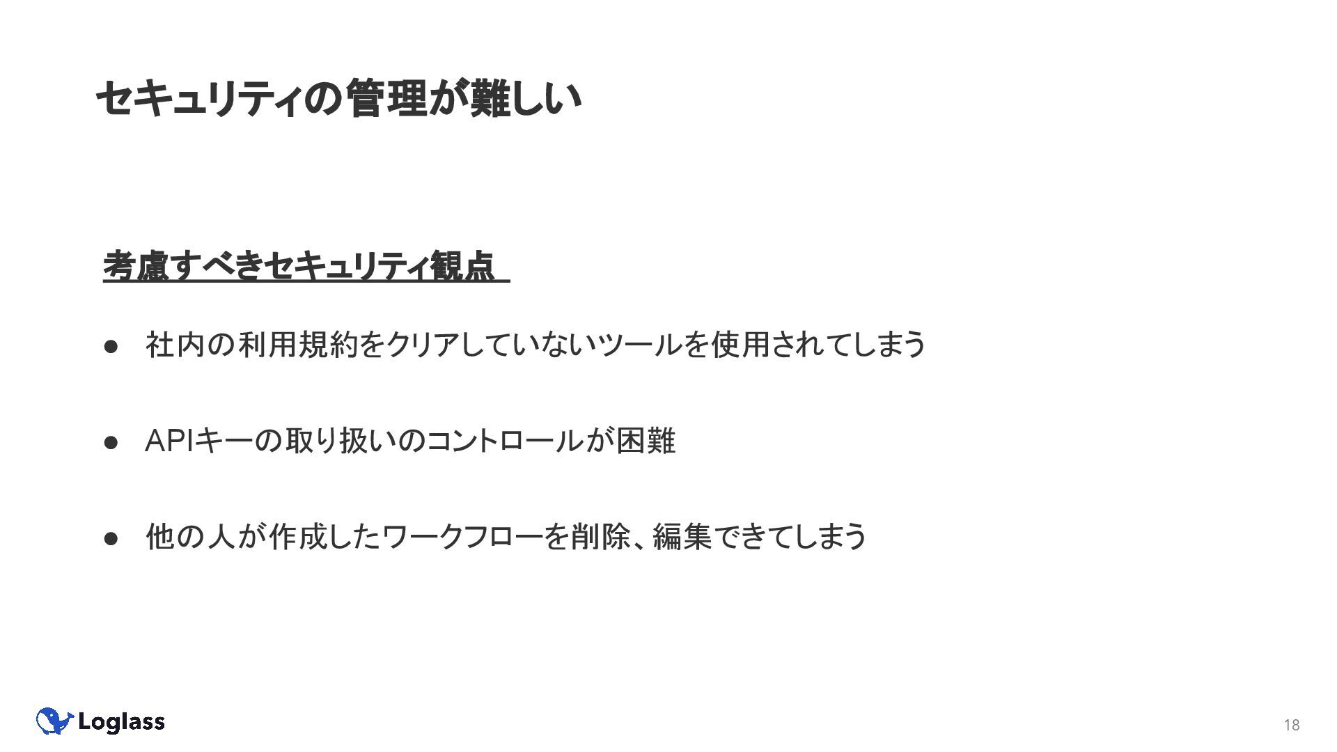 18 セキュリティの管理が難しい • 社内の利用規約をクリアしていないツールを使用されてしまう • APIキーの取り扱いのコントロールが困難 • 他の人が作成したワークフローを削除、編集できてしまう 考慮すべきセキュリティ観点