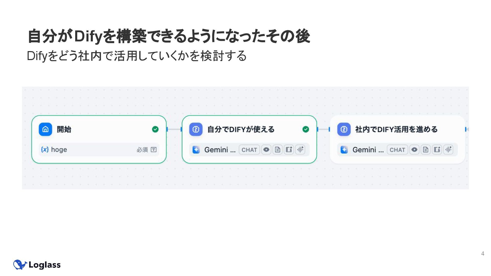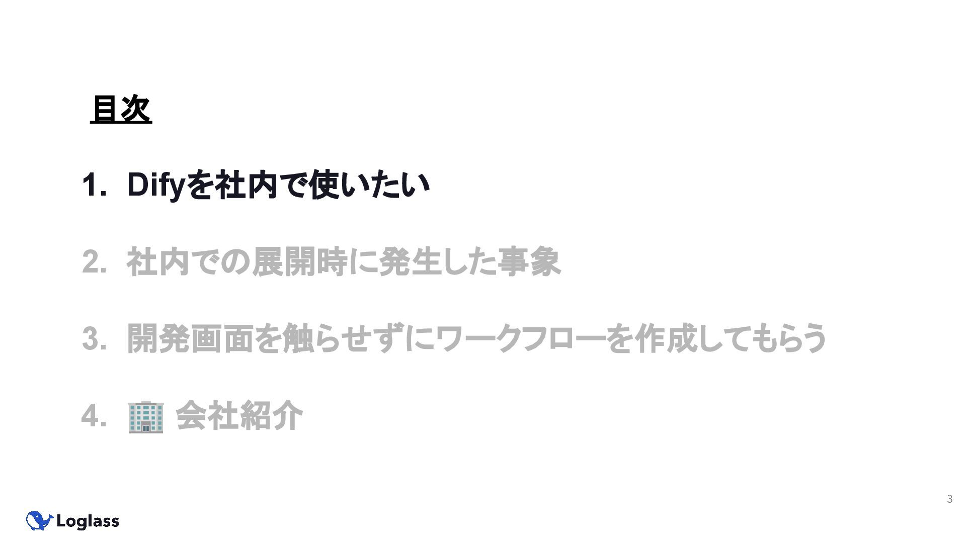 3 1. Difyを社内で使いたい 2. 社内での展開時に発生した事象 3. 開発画面を触らせずにワークフローを作成してもらう 4. 🏢 会社紹介