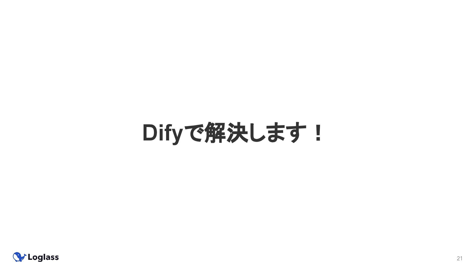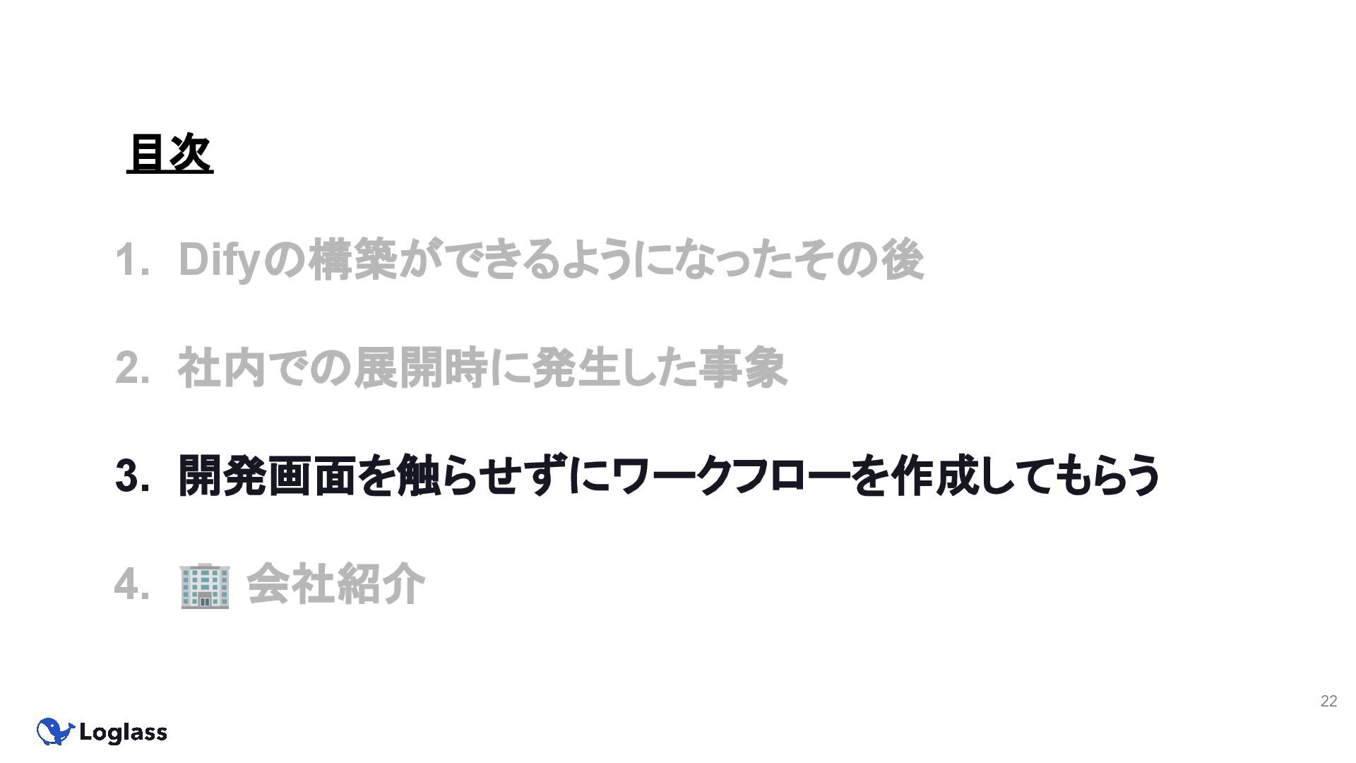 22 1. Difyの構築ができるようになったその後 2. 社内での展開時に発生した事象 3. 開発画面を触らせずにワークフローを作成してもらう 4. 🏢 会社紹介