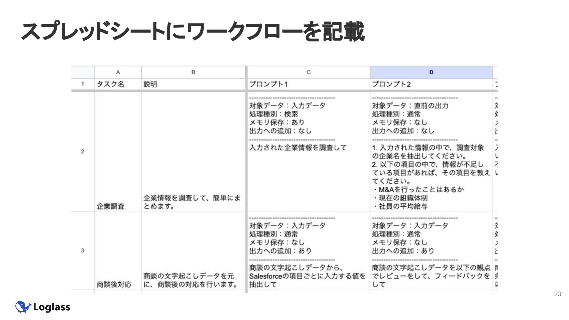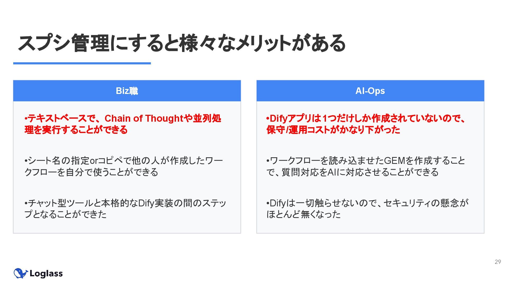 29 スプシ管理にすると様々なメリットがある Biz職 •テキストベースで、 Chain of Thoughtや並列処 理を実行することができる •シート名の指定orコピペで他の人が作成したワー クフローを自分で使うことができる