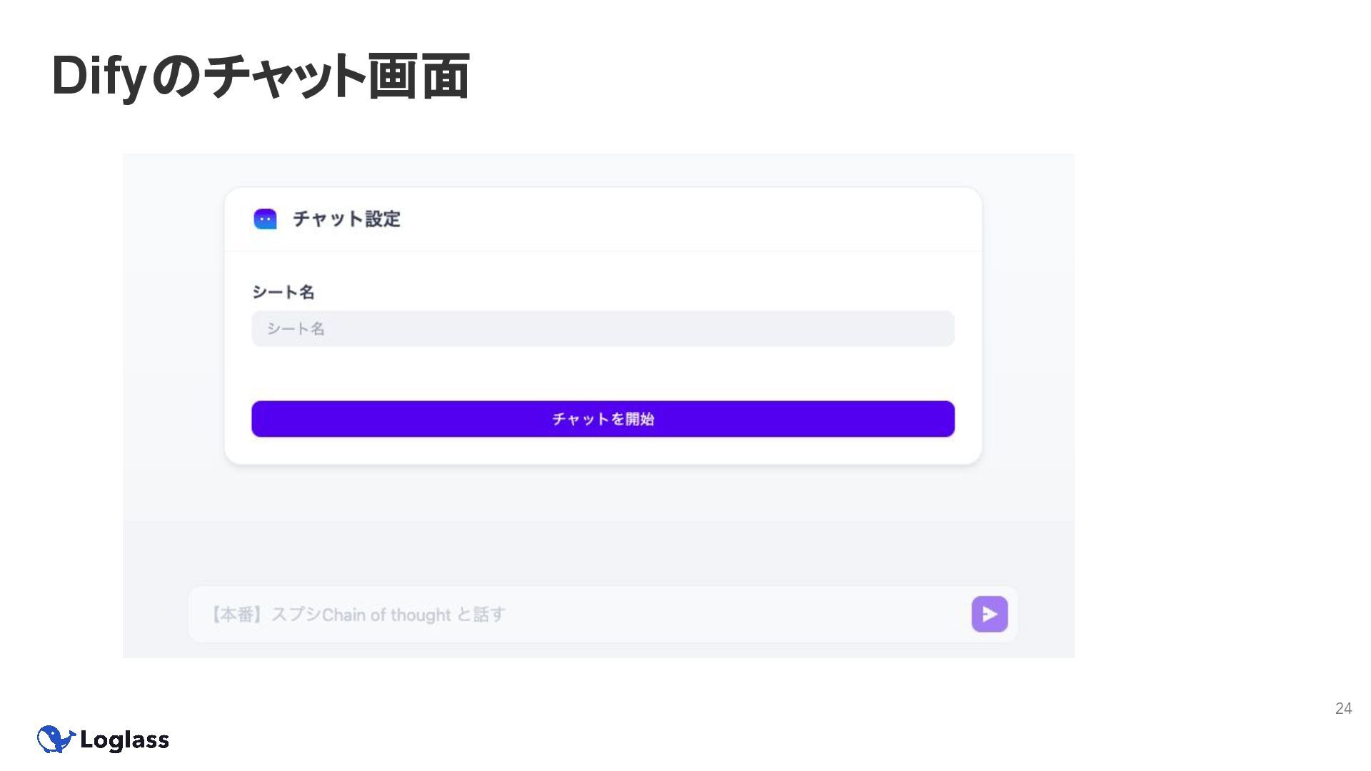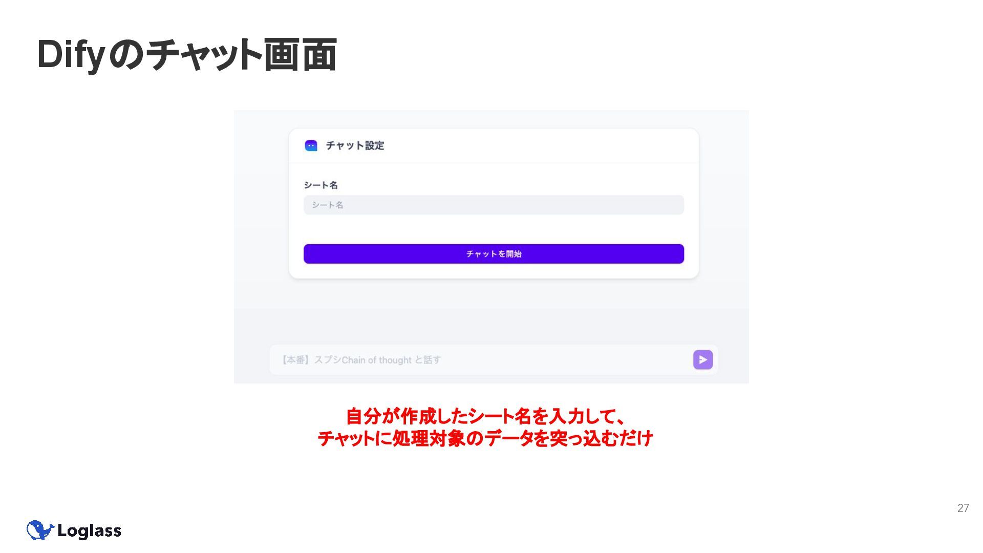 27 自分が作成したシート名を入力して、 チャットに処理対象のデータを突っ込むだけ Difyのチャット画面