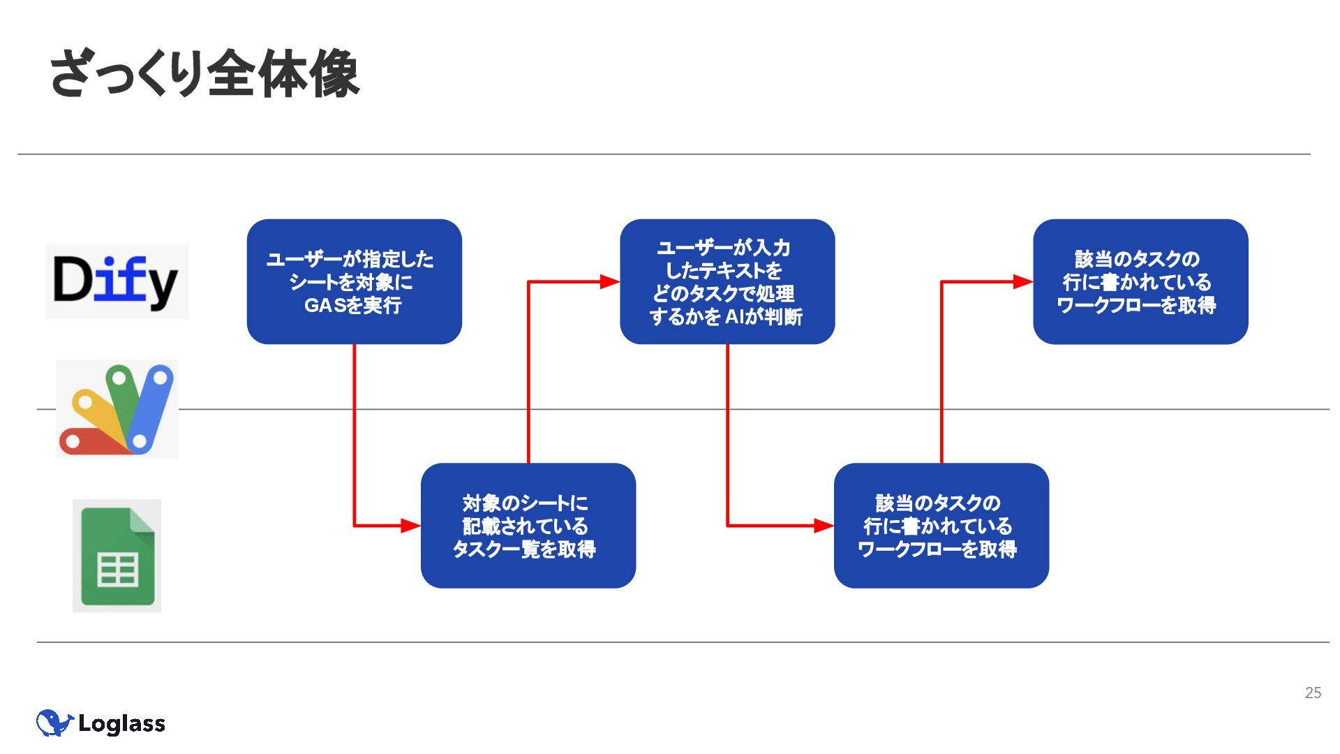 25 ざっくり全体像 ユーザーが指定した シートを対象に GASを実行 対象のシートに 記載されている タスク一覧を取得 ユーザーが入力 したテキストを