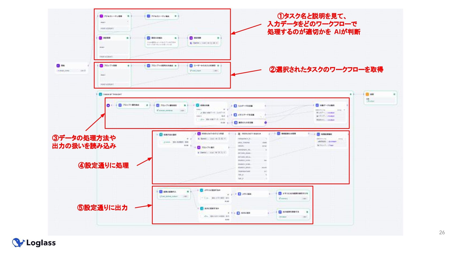 26 ①タスク名と説明を見て、 入力データをどのワークフローで 処理するのが適切かを AIが判断 ②選択されたタスクのワークフローを取得 ③データの処理方法や 出力の扱いを読み込み ④設定通りに処理 ⑤設定通りに出力