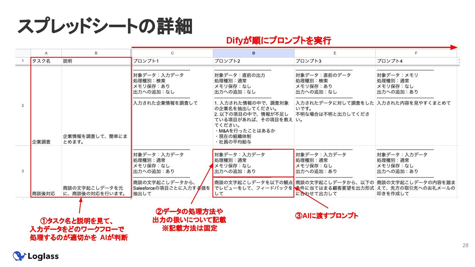 28 Difyが順にプロンプトを実行 ②データの処理方法や 出力の扱いについて記載 ※記載方法は固定 ③AIに渡すプロンプト ①タスク名と説明を見て、 入力データをどのワークフローで 処理するのが適切かを AIが判断
