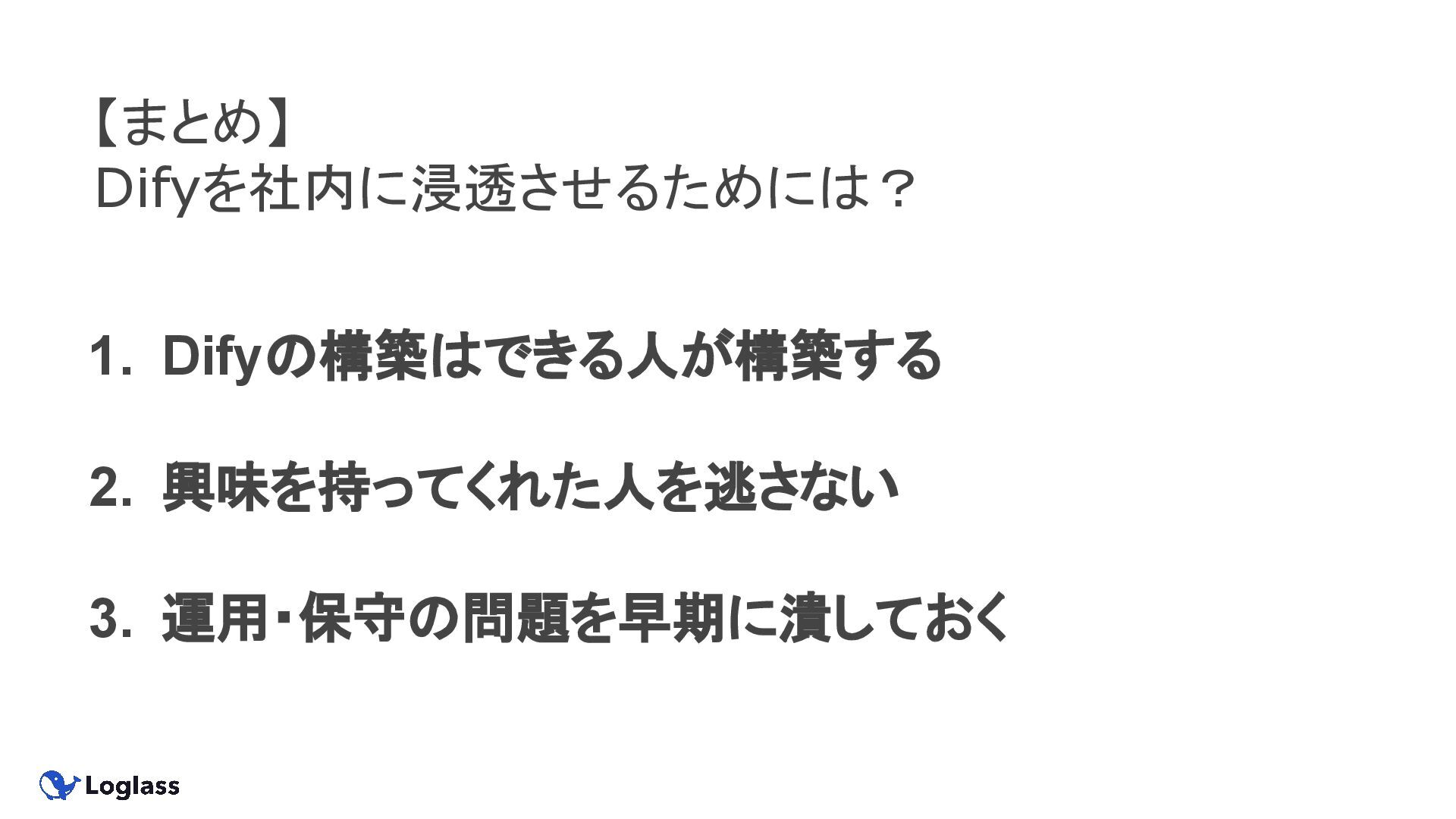 【まとめ】 Difyを社内に浸透させるためには? 1. Difyの構築はできる人が構築する 2. 興味を持ってくれた人を逃さない 3. 運用・保守の問題を早期に潰しておく