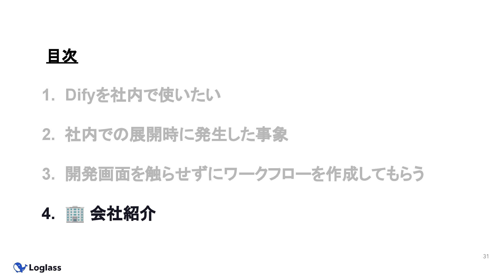 31 1. Difyを社内で使いたい 2. 社内での展開時に発生した事象 3. 開発画面を触らせずにワークフローを作成してもらう 4. 🏢 会社紹介