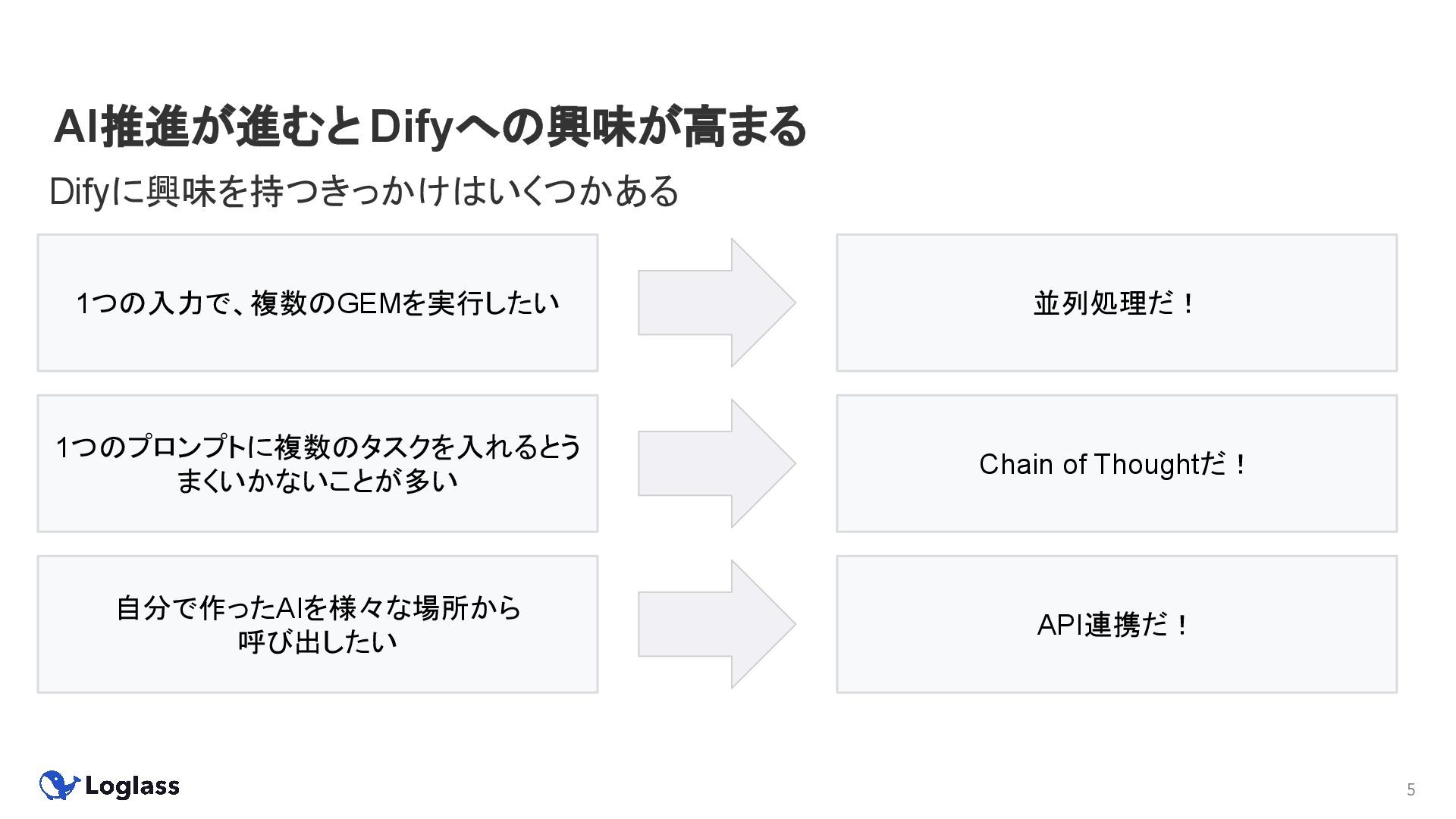 5 AI推進が進むと Difyへの興味が高まる 1つの入力で、複数のGEMを実行したい 1つのプロンプトに複数のタスクを入れるとう まくいかないことが多い 自分で作ったAIを様々な場所から 呼び出したい 並列処理だ! Chain