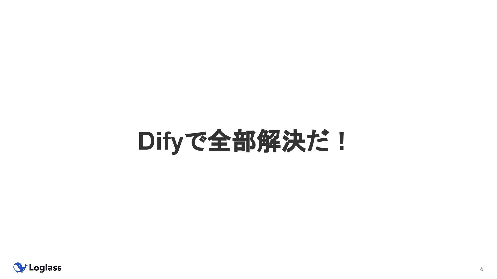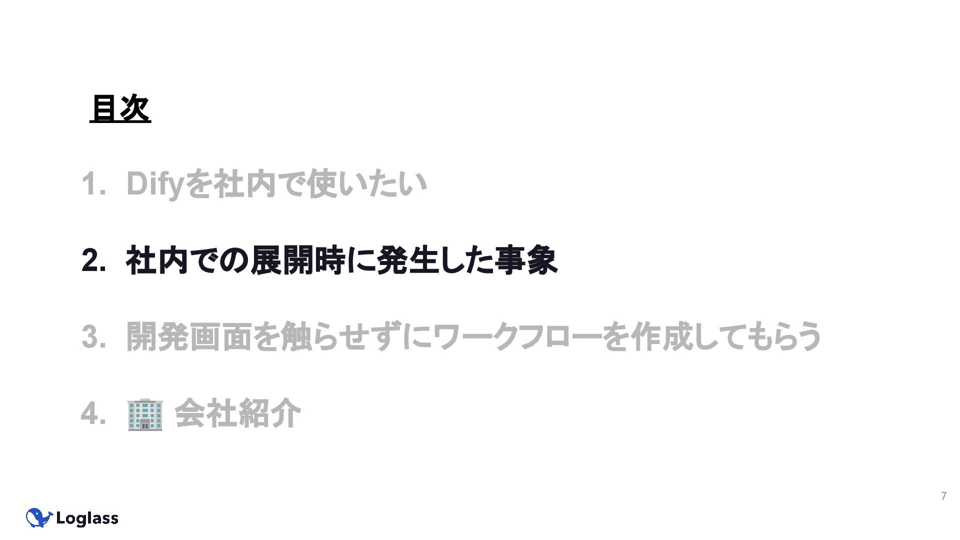 7 1. Difyを社内で使いたい 2. 社内での展開時に発生した事象 3. 開発画面を触らせずにワークフローを作成してもらう 4. 🏢 会社紹介