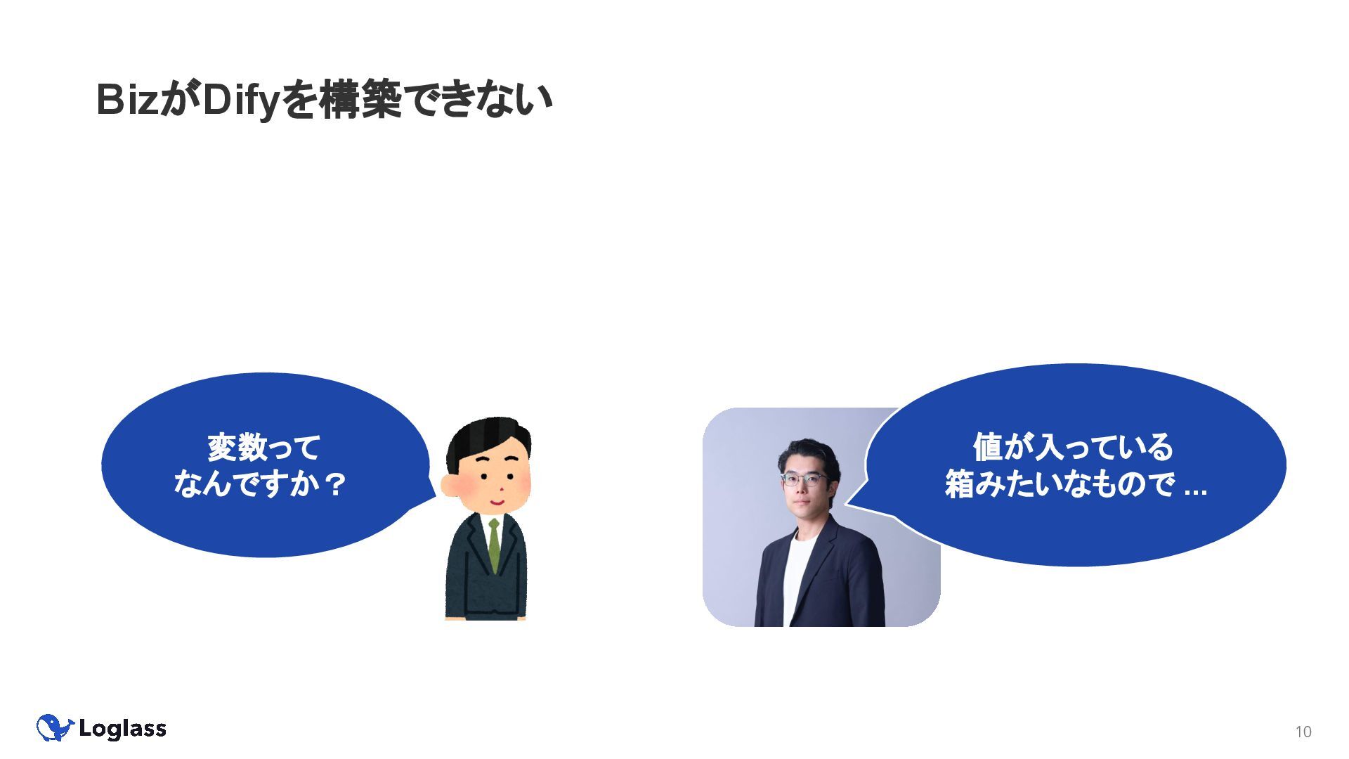 10 変数って なんですか? 値が入っている 箱みたいなもので ... BizがDifyを構築できない
