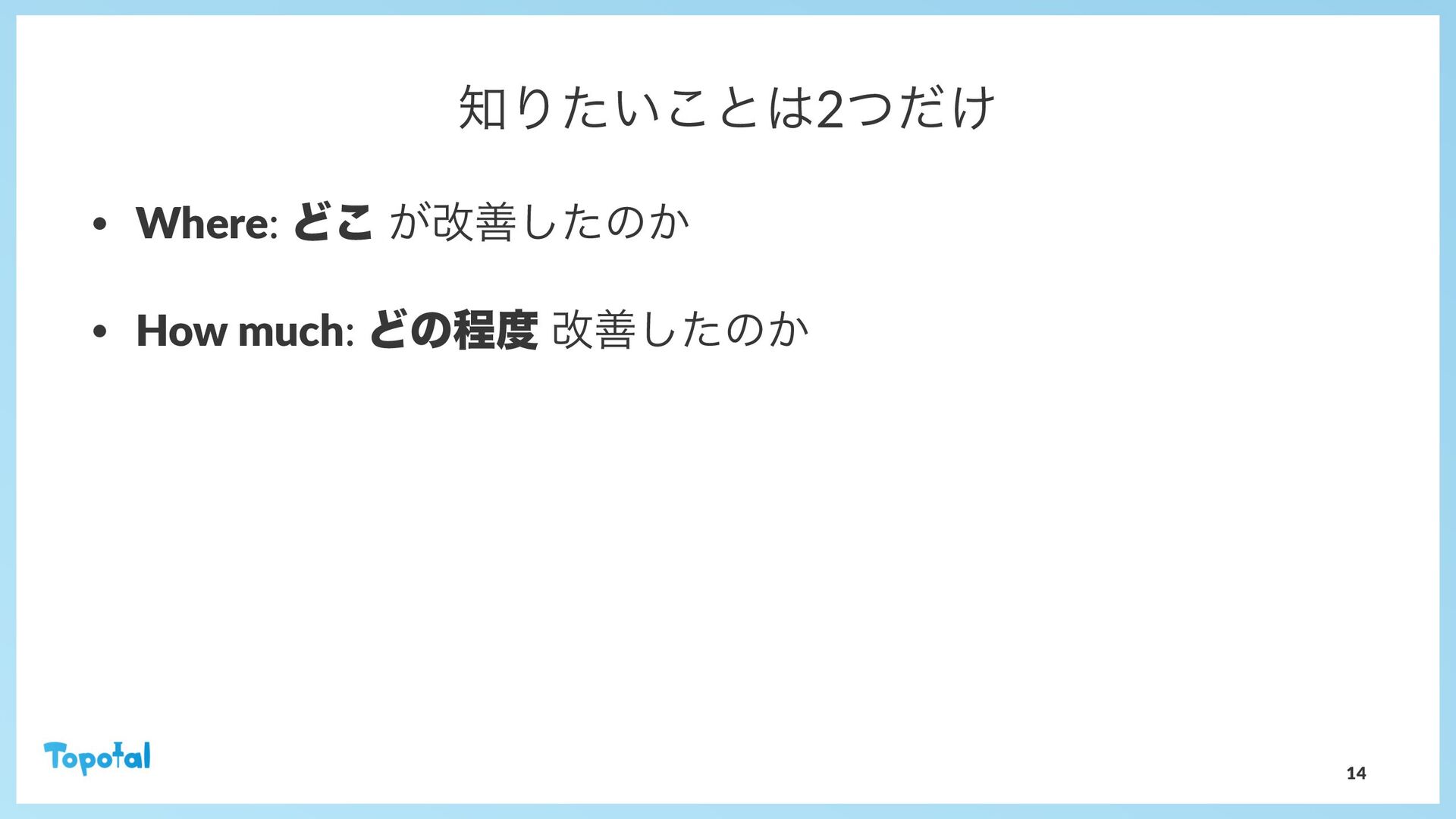 Γ͍ͨ͜ͱ2͚ͭͩ • Where: Ͳ͜ ͕վળͨ͠ͷ͔ • How much: Ͳͷఔ վળͨ͠ͷ͔