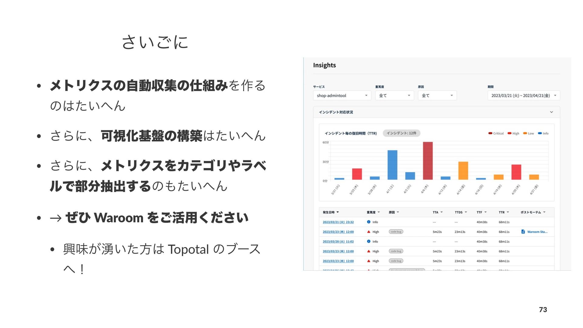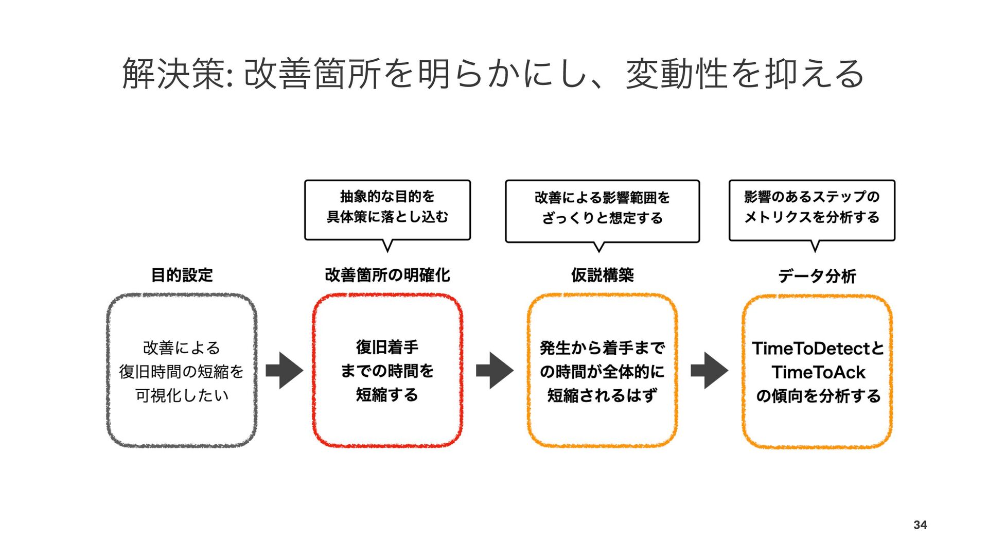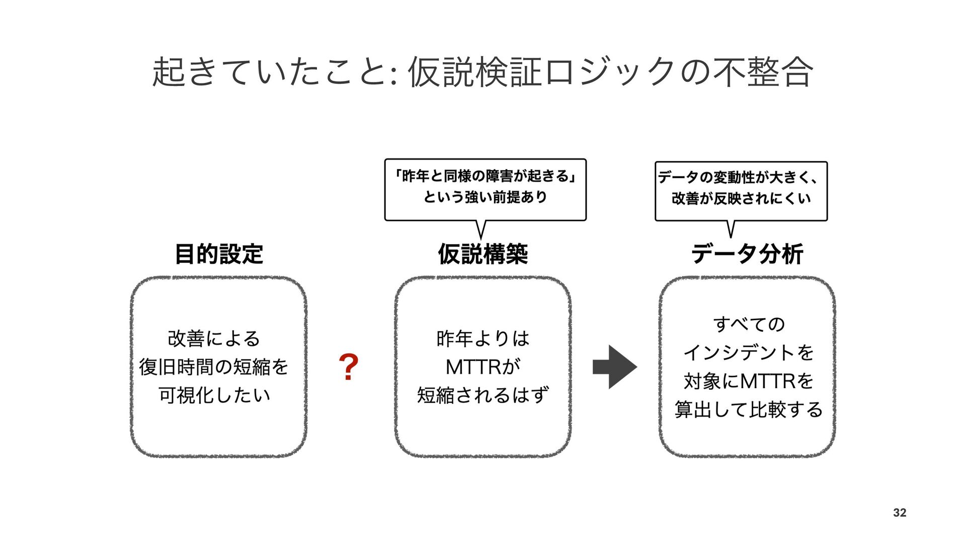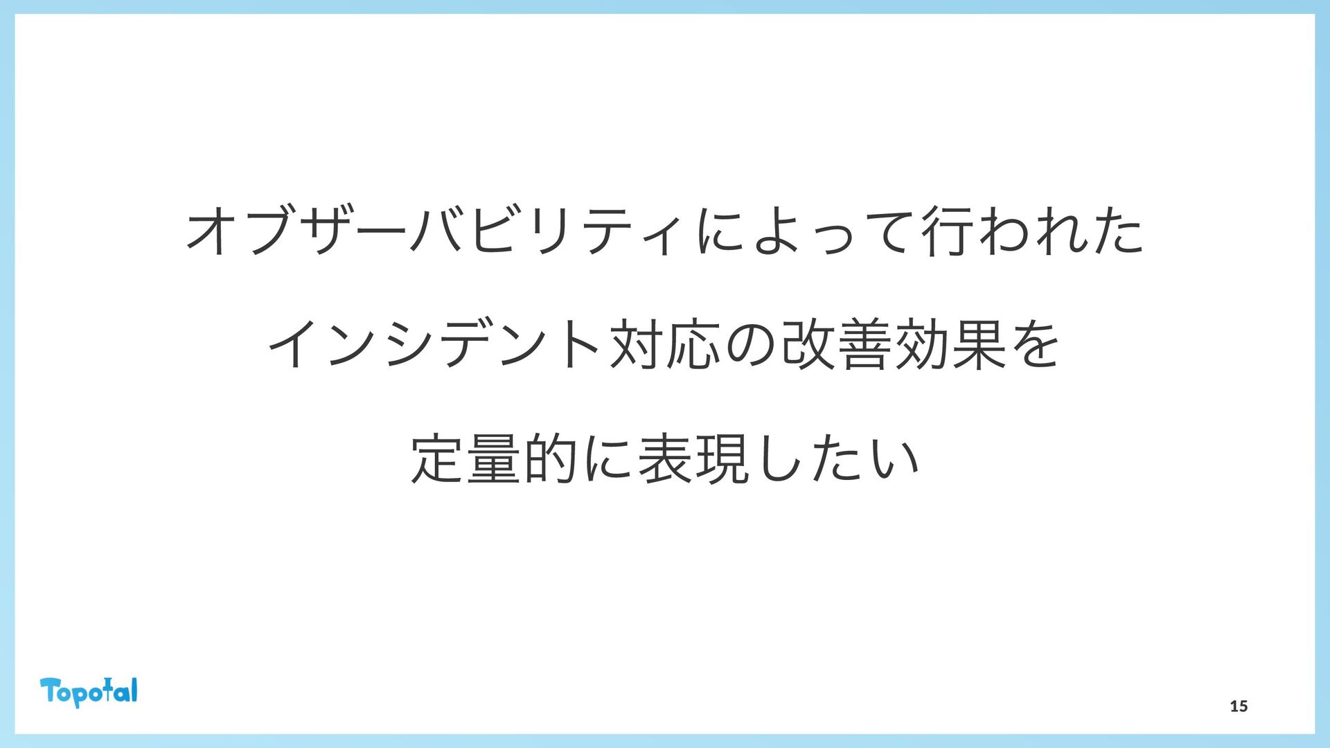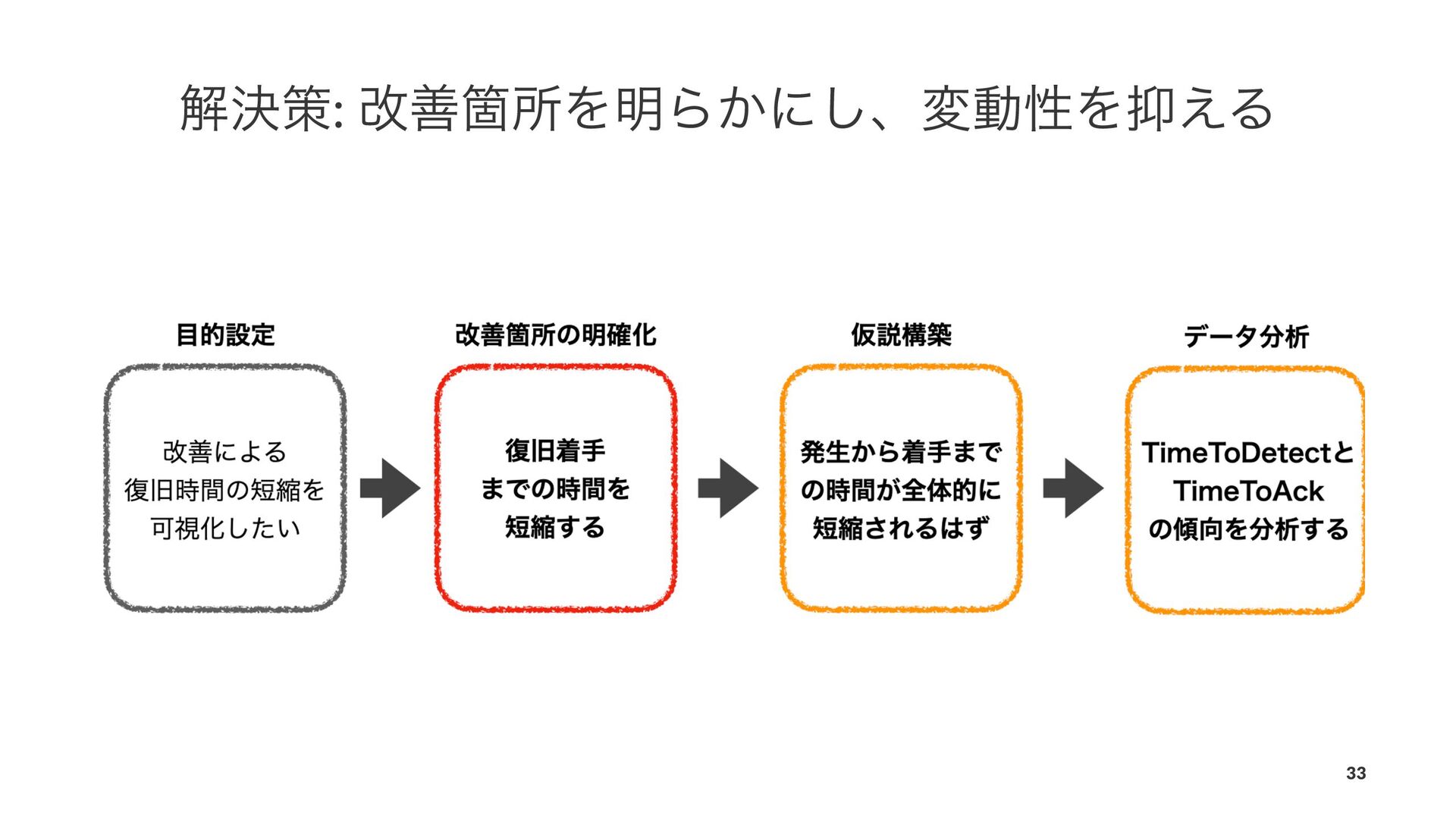 ͳʹ͕ͩͬͨͷʁ ֤ཁૉͳ͍ • Πϯγσϯτظؒͷมಈੑ͕ߴ͍͜ͱ • MTTRΛͳΜΒ͔ͷࢦඪʹ͢Δ͜ͱ • ࢦඪΛͱʹվળͷՌΛ֬ೝ͢Δ͜ͱ → తͱࢦඪ͕טΈ߹͍ͬͯͳ͍͜ͱ͕