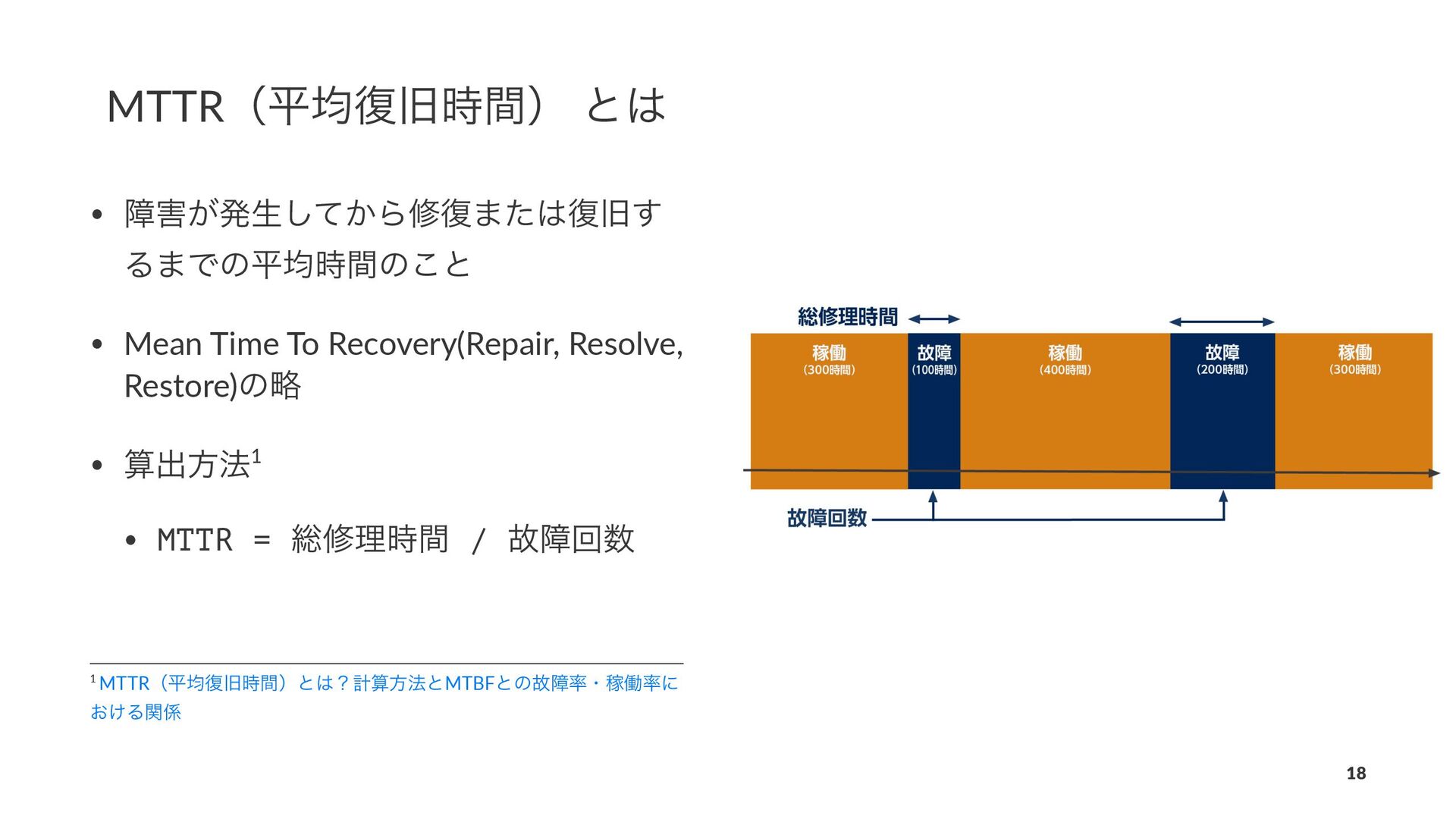 Resolve, Restore)ͷུ • ࢉग़ํ๏1 • MTTR = ૯मཧ࣌ؒ / ނোճ 1 MTTRʢฏۉ෮چ࣌ؒʣͱʁܭࢉํ๏ͱMTBFͱͷނোɾՔಇʹ ͓͚Δؔ 18