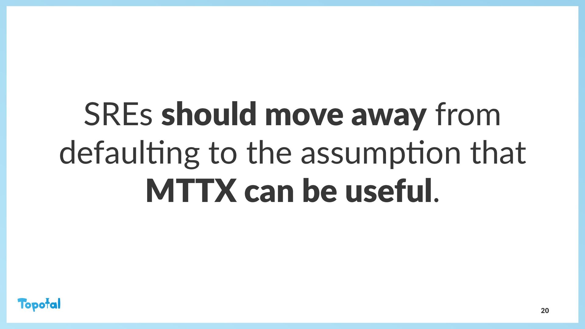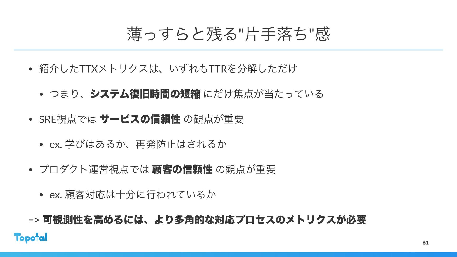 ബͬ͢ΒͱΔ"ยखམͪ"ײ • հͨ͠TTXϝτϦΫεɺ͍ͣΕTTRΛղ͚ͨͩ͠ • ͭ·ΓɺγεςϜ෮چ࣌ؒͷॖ ʹ͚ͩয͕͍ͨͬͯΔ • SREࢹͰ αʔϏεͷ৴པੑ ͷ؍͕ॏཁ